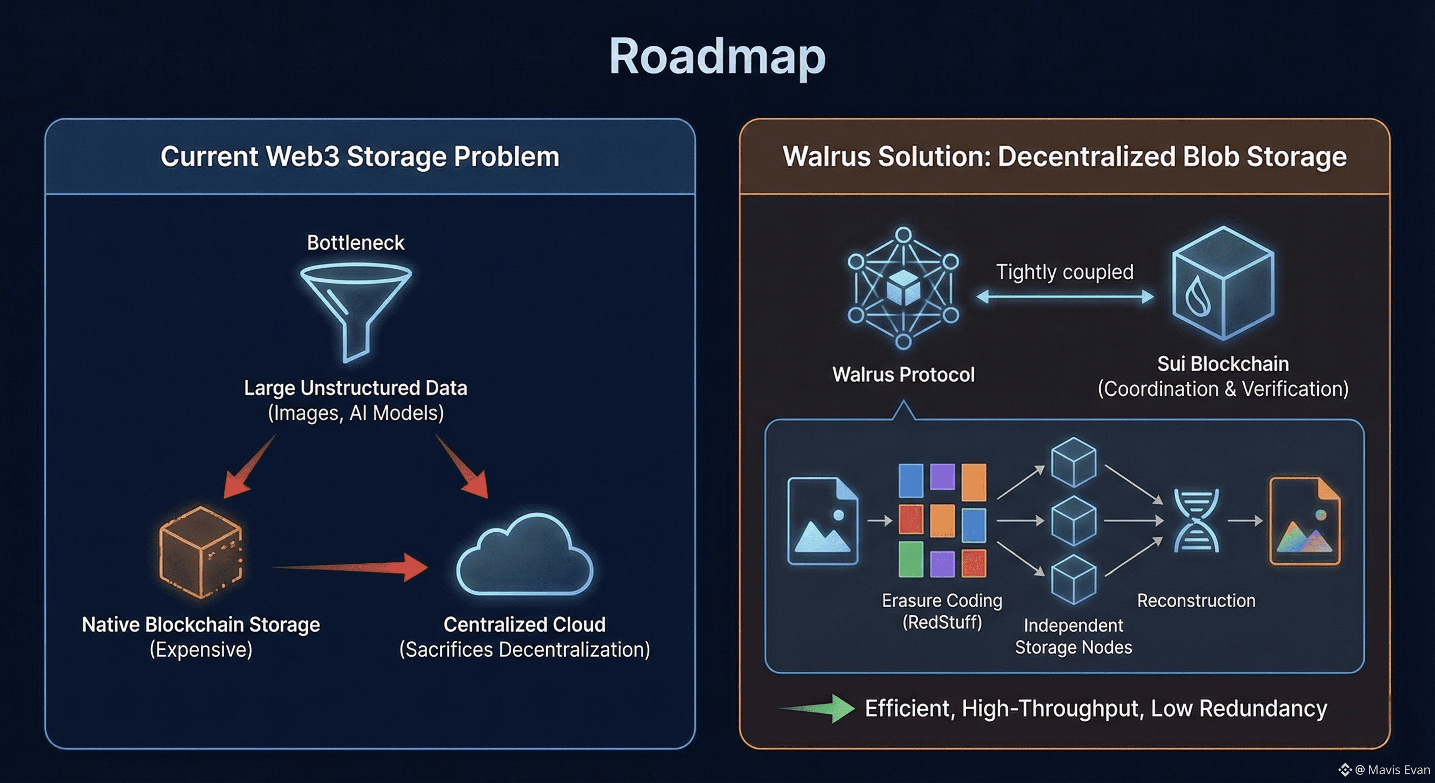 @Walrus 🦭/acc As blockchain systems mature, one constraint keeps resurfacing: data. Decentralized applications are increasingly required to store and serve large volumes of unstructured information images, video, AI model weights, application assets yet most blockchains were never designed for this role. Native on-chain storage is prohibitively expensive, while centralized cloud solutions sacrifice decentralization and control. Early decentralized storage networks attempted to bridge the gap but often introduced inefficiencies, heavy redundancy, or weak integration with smart contracts. Walrus positions itself as a structural answer to this problem by offering a decentralized blob storage layer that is tightly coupled with the Sui blockchain and optimized for Web3-native workloads.
