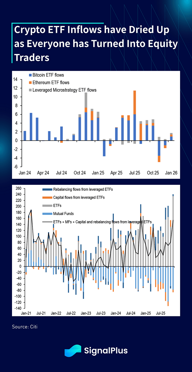 As criptomoedas tiveram mais uma semana muito errática, com o BTC pairando em torno de $92k com muito pouca empolgação. Os influxos de ETFs BTC/ETH foram decepcionantes em dezembro e até agora em janeiro, com os influxos mal vendo qualquer recuperação após o horrível período de outubro. Por outro lado, os ETFs de ações TradFi viram influxos mensais recordes de $235 bilhões para encerrar 2025, já que os investidores praticamente mudaram seus hábitos de degen para negociação de ações, e não está claro quais catalisadores imediatos temos para reverter essa tendência no curto prazo.