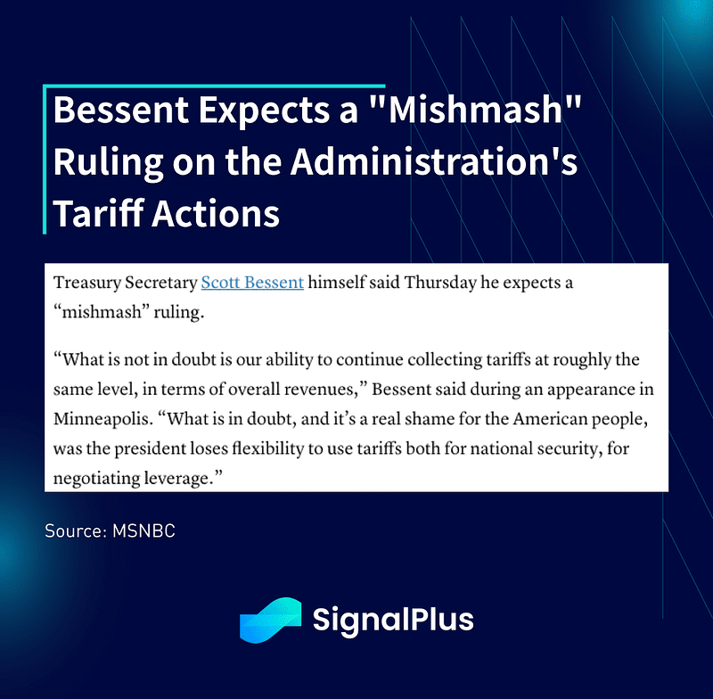 Em outros lugares, o grande foco esta semana foi a decisão da Suprema Corte dos EUA sobre a IEEPA (tarifas de Trump), da qual ainda não vimos notícias. Um resultado de 'melhor caso' seria que o tribunal impedisse a administração de impor tarifas unilaterais daqui para frente, mas permitindo que as tarifas existentes permaneçam como uma exceção para um compromisso político. Segundo analistas da Street, o próximo dia de opinião em que uma decisão pode ser divulgada pode ser na quarta-feira desta semana.