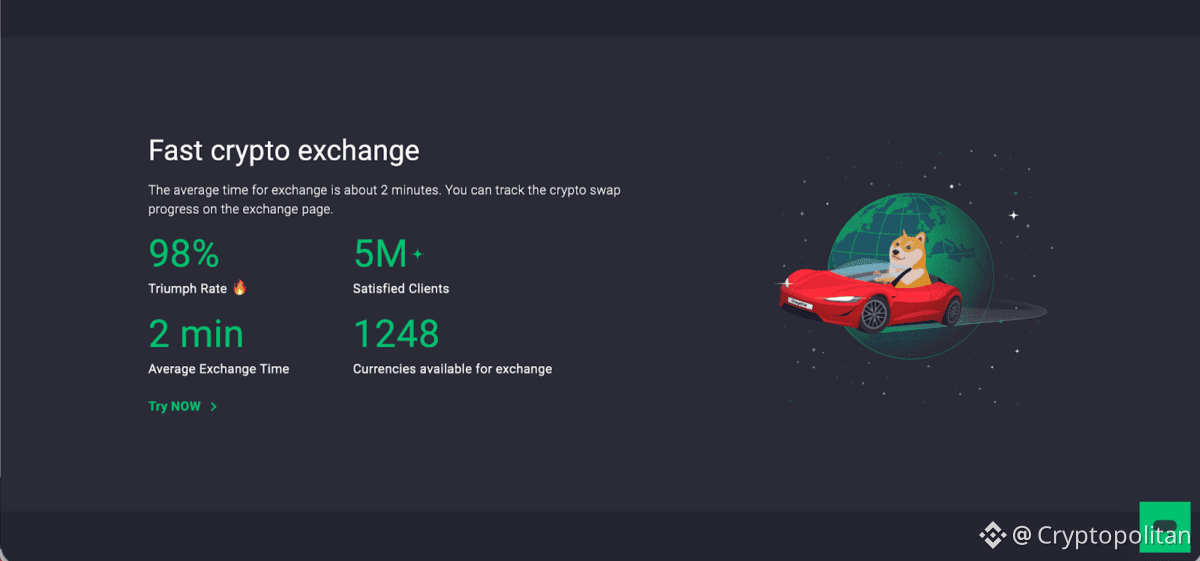 Transparency and speed are at the core of the platform. Rates/fees are displayed clearly before initiating any transactions and swaps are handled within 1-2 minutes. The platform also mentions that 98% of all swaps are completed at the estimated rate or a more favorable rate in a few minutes, with exchange rate deviations kept below 0.5%. The platform also holds a 4.5 rating on Trustpilot, based on nearly 12,500 reviews.
