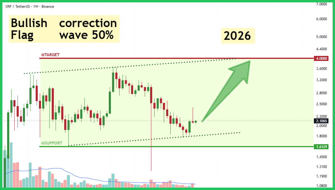O gráfico mostra claramente que o $XRP está se consolidando dentro de um padrão clássico de Bandeira de Alta após um forte impulso inicial. Observamos um reteste crucial e um recuo próximo à zona de suporte inferior do canal em $1,61. Enquanto esta estrutura de bandeira se mantiver, o caminho de menor resistência é para cima. A área imediata de interesse é a faixa de preço atual ($2,1065). Uma quebra bem-sucedida acima da fronteira superior sinaliza uma aceleração em direção ao alvo psicológico e histórico de resistência em $4,00.
