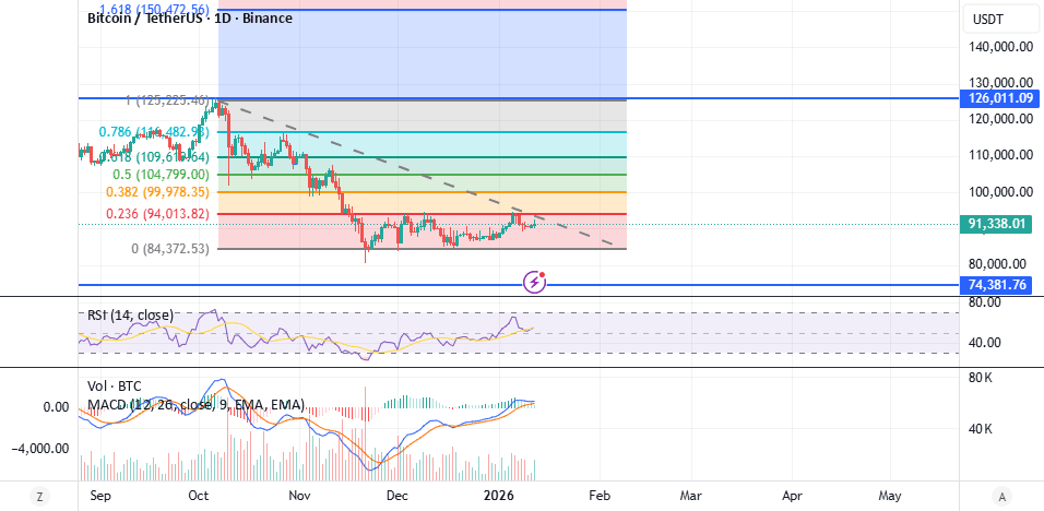 Desde que o preço permaneça abaixo da resistência e da zona de Fibonacci mencionada, a tendência bearish continua, com atenção especial ao comportamento do preço próximo a 74.000 dólares, que pode determinar se este movimento é apenas uma correção mais aprofundada ou o início de uma reversão de longo prazo.