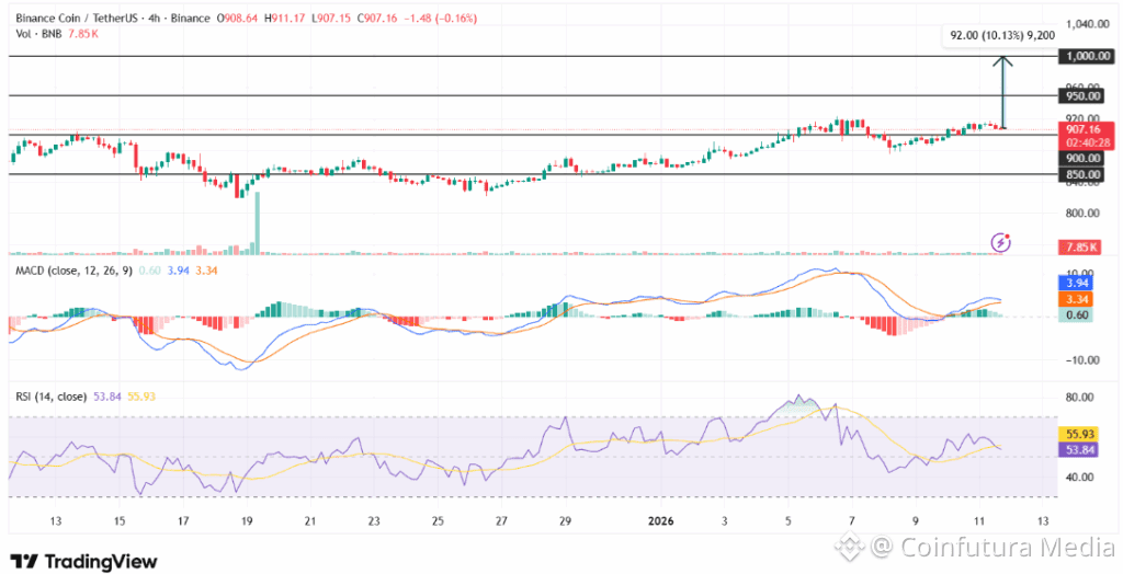 Technically, BNB has recovered its support zone at the price of $900 and has remained on a steady positive chart on the 4-hour chart. The MACD indicator demonstrated a bullish crossover, and the RSI was 56.10, which meant that the existing positive momentum was not followed by the crossing into the overbought territory. The second line of resistance is near the range of approximately 950; the psychological level of 1,000 is the target.