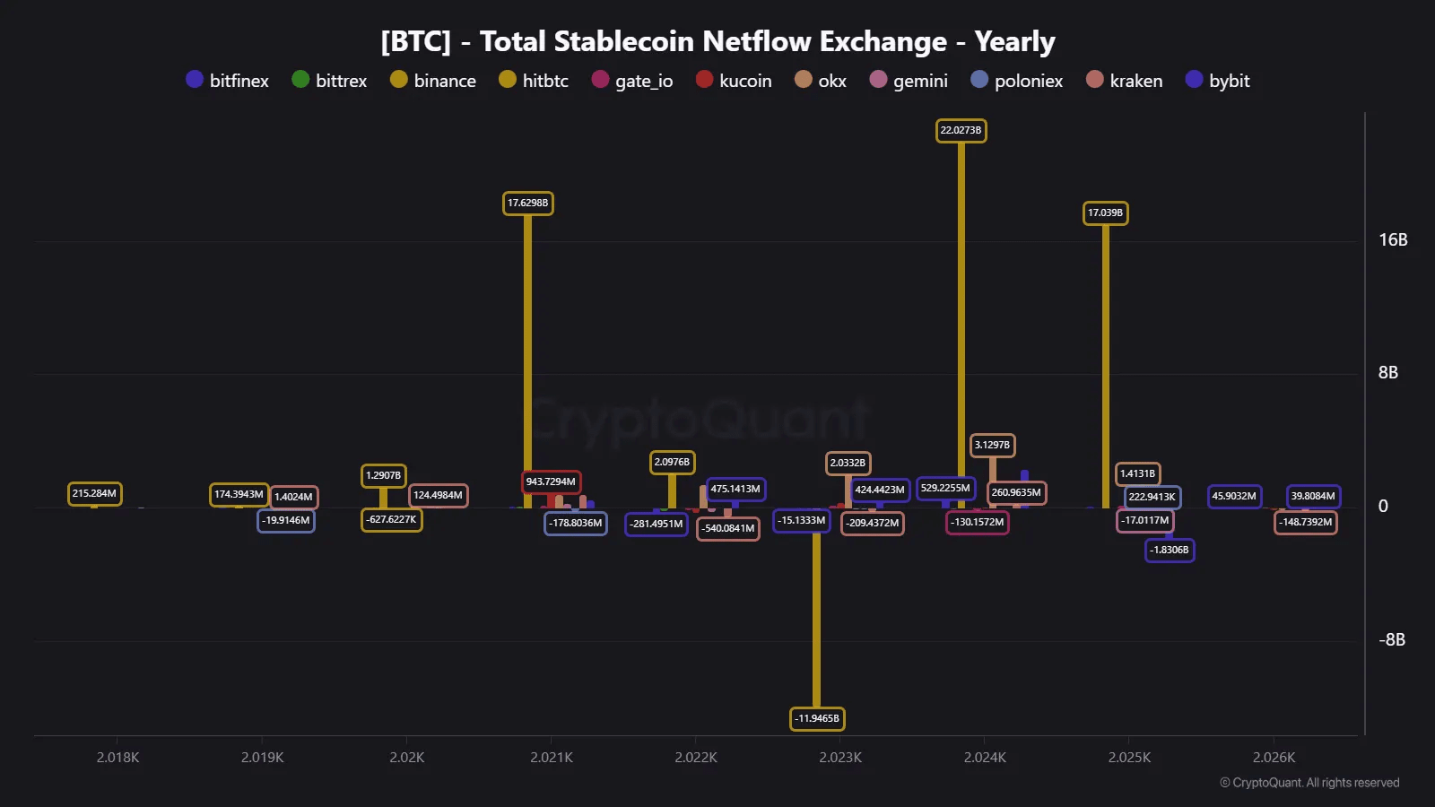A liquidez é o sangue vital do cripto, e as stablecoins são sua moeda primária. Em 2025, os influxos líquidos de stablecoin da Binance alcançaram +$17,04B, seguindo um recorde de +$22,03B em 2024.