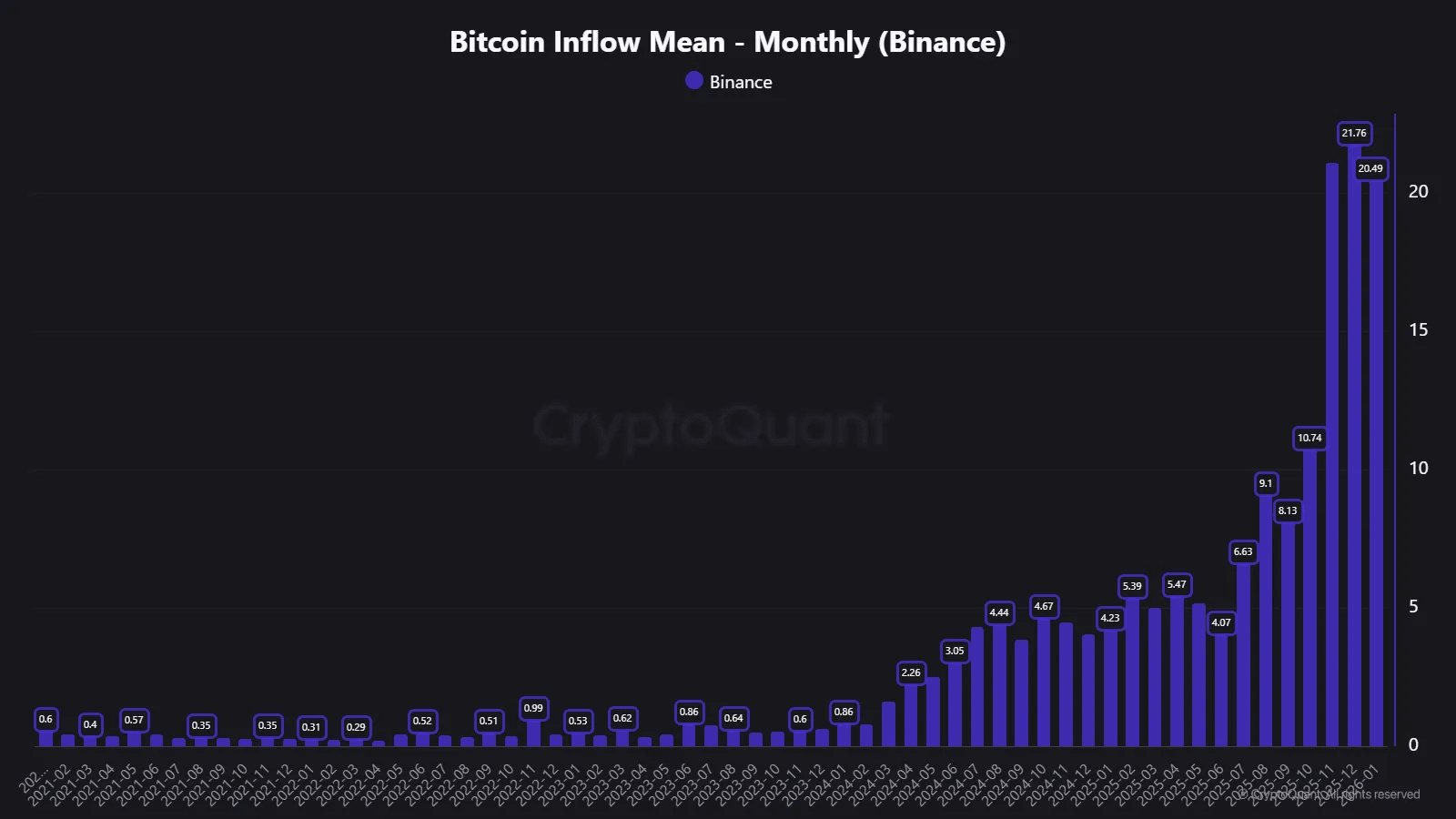 Começando em 2024, esse piso desapareceu. Em meados de 2025, os depósitos estabilizaram na faixa de 4 a 6 BTC. À medida que avançamos para o início de 2026, os dados dispararam para níveis institucionais, frequentemente atingindo picos de 20,49 BTC e 21,76 BTC por transação.