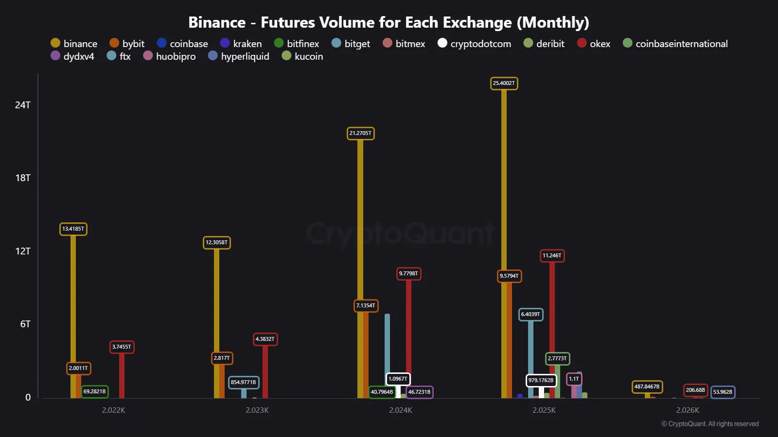 Quando o mercado se move, ele se move na Binance. Em 2025, a Binance processou impressionantes $25,4 Trilhões em volume de derivativos, quase igualando seu desempenho de 2024, enquanto seus rivais mais próximos, OKX e Bybit, ficaram para trás com $11,3T e $9,6T, respectivamente.