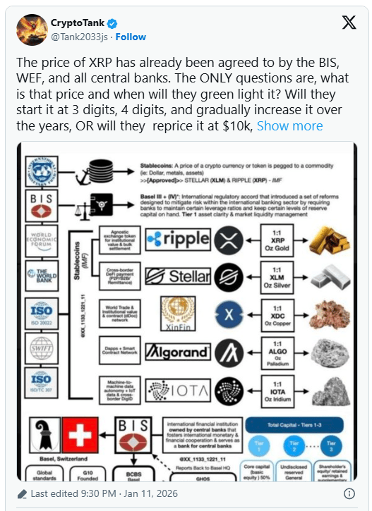A afirmação mais significativa no post do CryptoTank é que o preço do XRP já foi acordado pelas autoridades financeiras globais, incluindo bancos centrais, com confirmação pública ainda por vir.