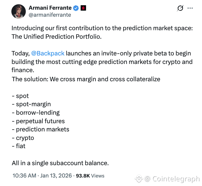 The exchange has launched private beta testing for its new platform, called the Unified Prediction Portfolio, Backpack CEO Armani Ferrante said in a post on X on Tuesday.
