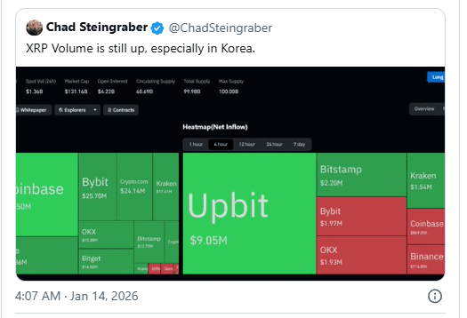 A análise de Steingraber destaca a atividade de negociação excepcionalmente alta como um indicador-chave de sentimento alcista. Notavelmente, a exchange sul-coreana Upbit representou 87,75 milhões de dólares em volume de XRP, correspondendo a mais de 20% das negociações spot globais. A atividade regional concentrada frequentemente sinaliza uma demanda local robusta, que pode atuar como catalisador para um impulso de mercado mais amplo.