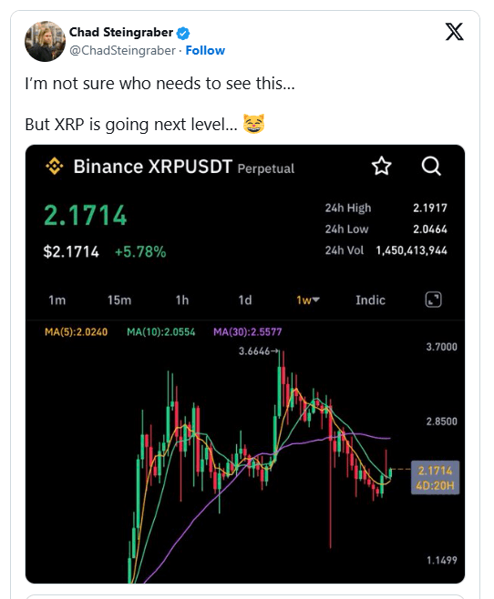 Em uma postagem recente no X, o analista de cripto Chad Steingraber destacou o cenário alcista emergente do XRP, chamando a atenção tanto para o movimento de preço quanto para a atividade de negociação. Ele observou que o XRP recentemente subiu para $2,17 nos futuros perpétuos do Binance, registrando um ganho de 5,78% em 24 horas, apoiado por $1,45 bilhão em volume de negociação global.