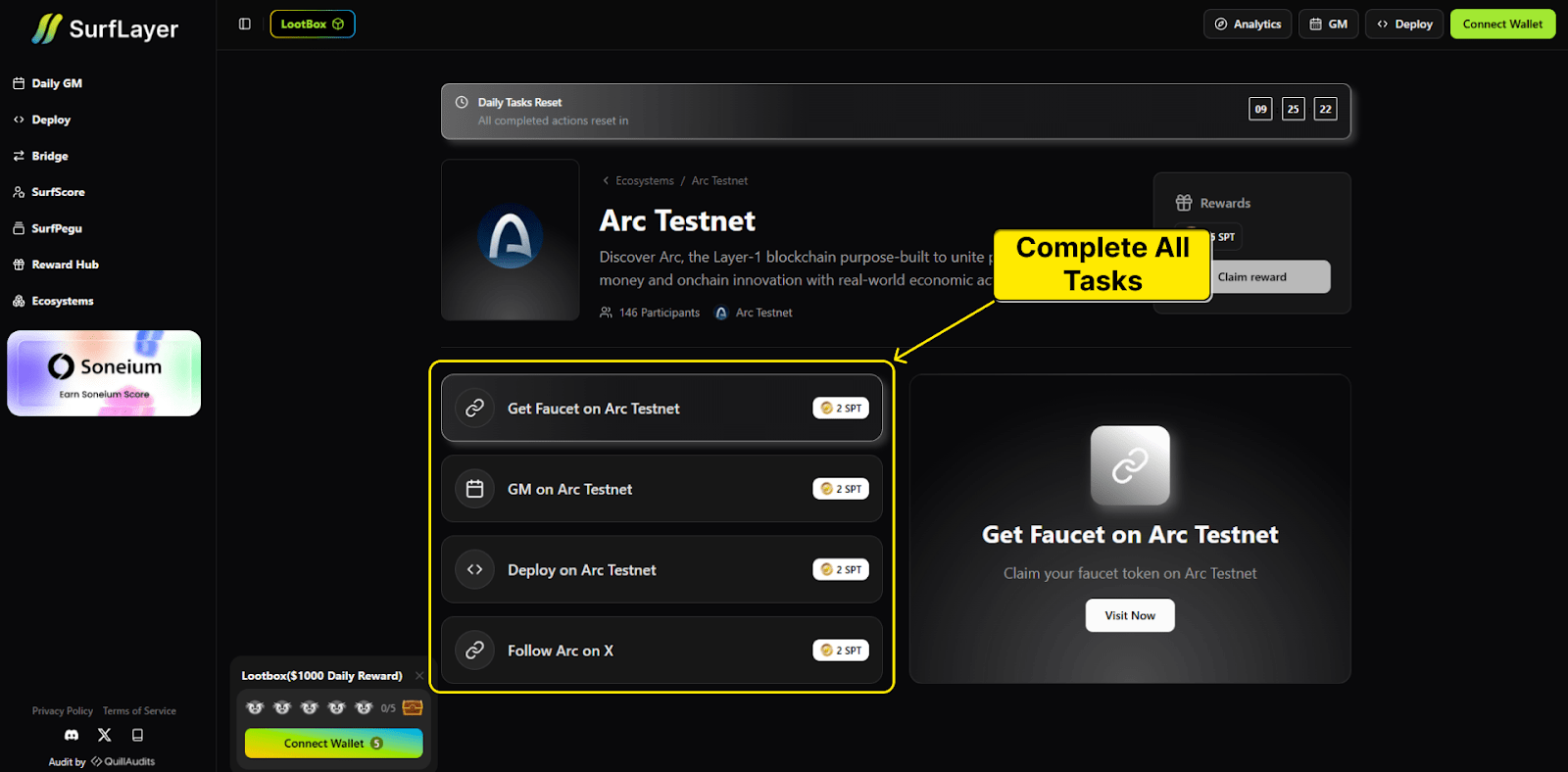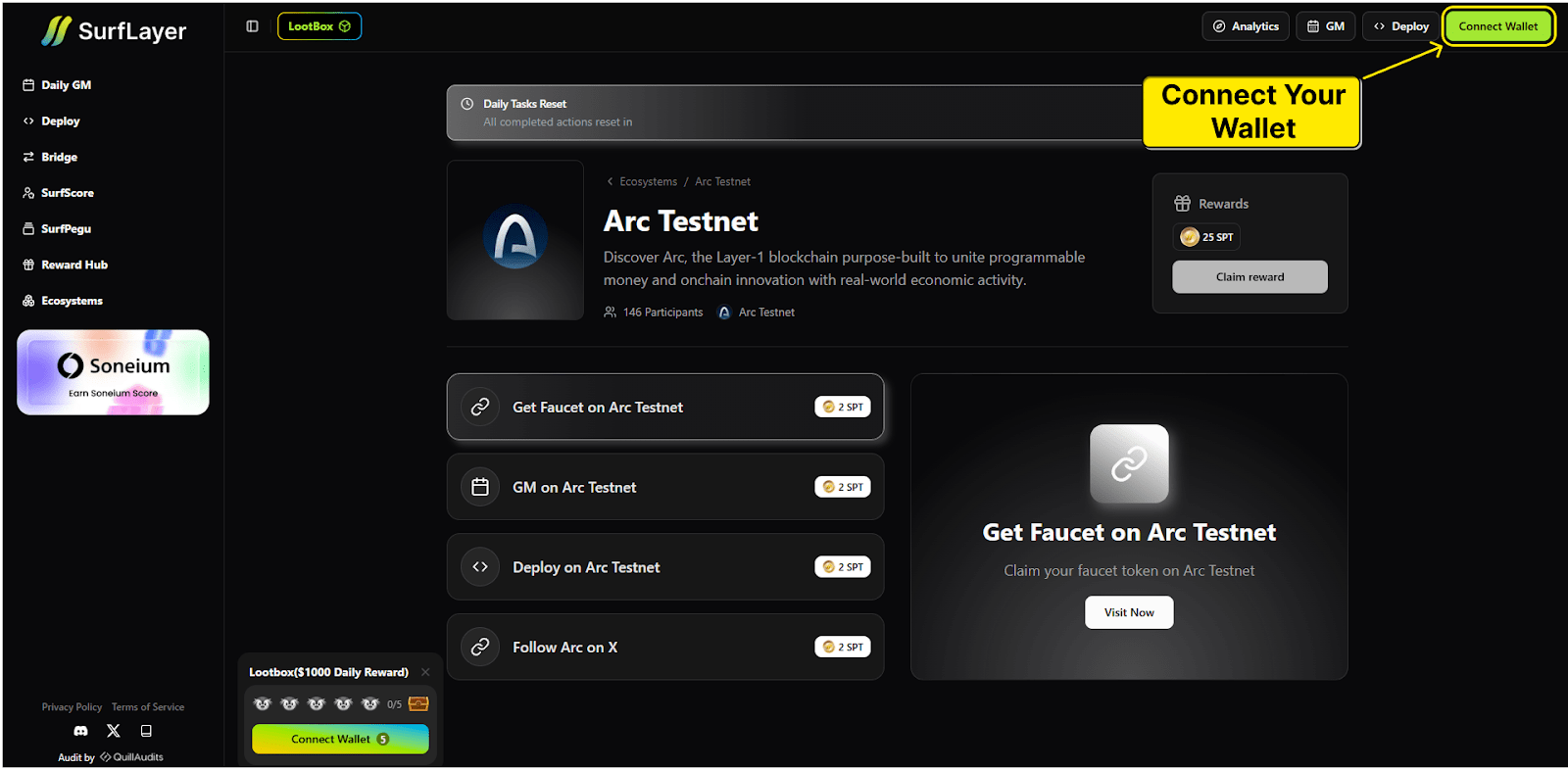 Passo 1: Acesse a Quest do ARC Testnet em https://surflayer.xyz/ecosystems/arc-testnet-iq5cab e conecte sua carteira.