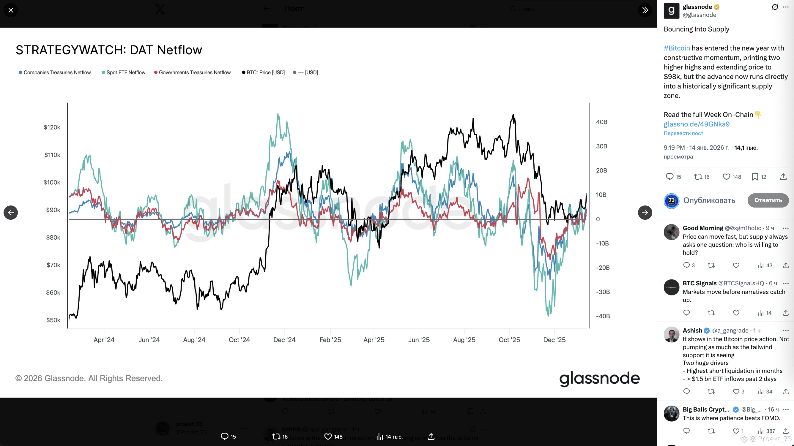 ИТОГО - локально структура улучшилась (меньше продаж от LTH + стабилизация ETF), но без явного притока капитала рост легко может превратиться в "встряску" на плечах. Для продолжения ралли рынку нужен режим "покупка сильнее предложения".
