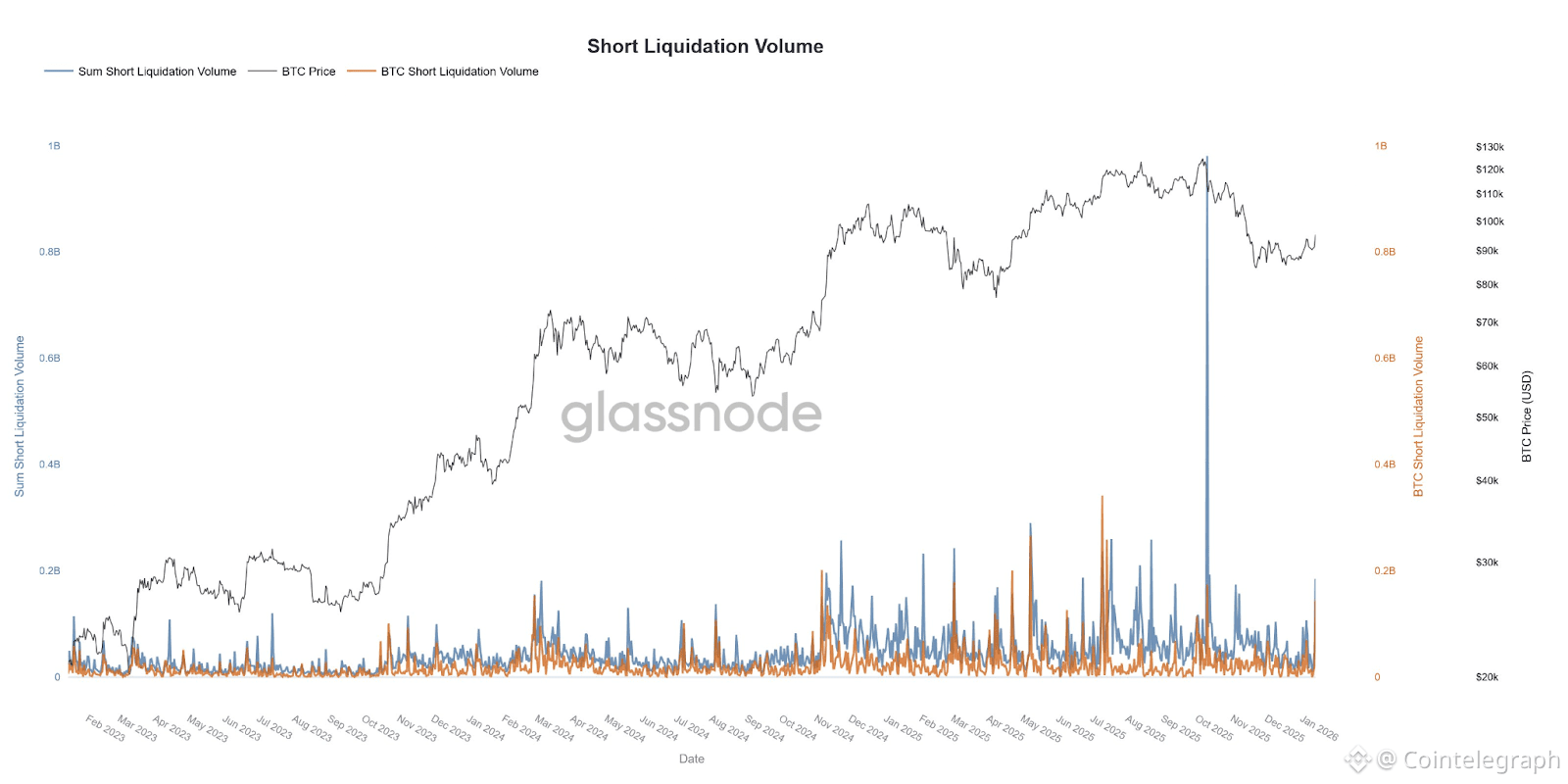 Short liquidations across crypto futures and perpetual contracts climbed to about $200 million on Wednesday, the highest level since roughly $1 billion in short positions were wiped out during the October market crash, according to data shared by analytics firm Glassnode. The firm said it was the biggest short liquidation event across the 500 largest cryptocurrencies since the Oct. 10 selloff.