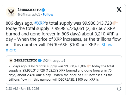 A afirmação de que o ativo alcançará $100 permanece uma opinião, e não um resultado garantido. No entanto, o argumento apresentado por 𝟸𝙷𝚁𝚂𝙲𝚁𝚈𝙿𝚃𝙾 se baseia em mecanismos observáveis, e não em hype. A oferta do XRP continua encolhendo, e seu modelo de utilidade exige um valor mais alto por token à medida que os volumes de transações crescem.