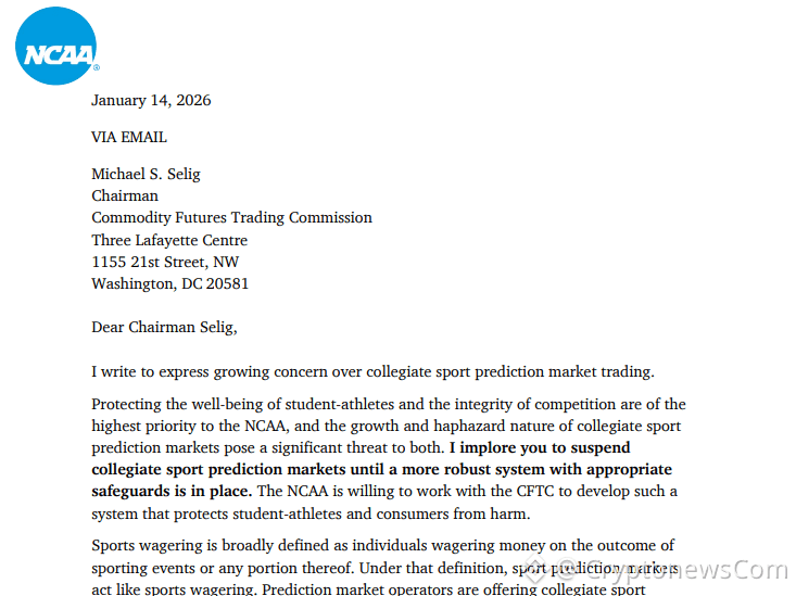 In a letter dated January 14, 2026, NCAA President Charlie Baker urged CFTC Chairman Michael Selig to halt collegiate sports prediction trading until stronger safeguards are put in place.