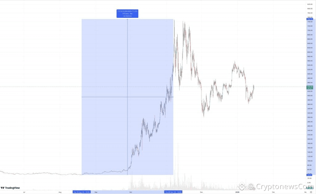 During the summer, ZEC was trading around $30. By November, its price surged above $750. This happened while the broader crypto market was selling off after Oct. 10.