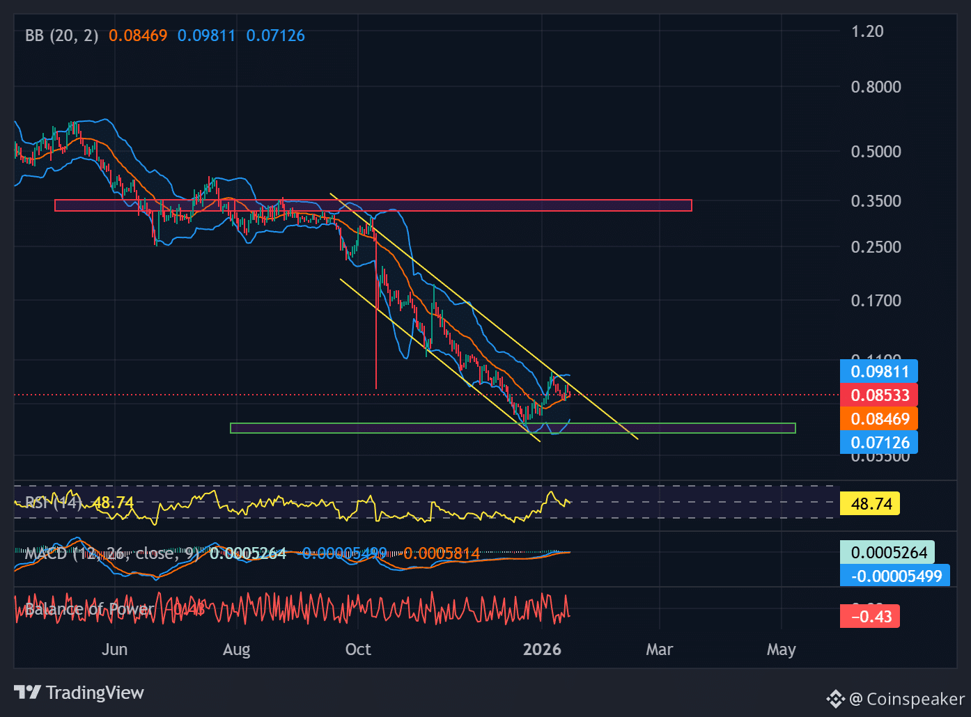 The short-term trend remains inside a falling channel. As long as price stays below $0.098-$0.10, rallies are corrective. A clean break and daily close above this zone would open a move toward $0.12.
