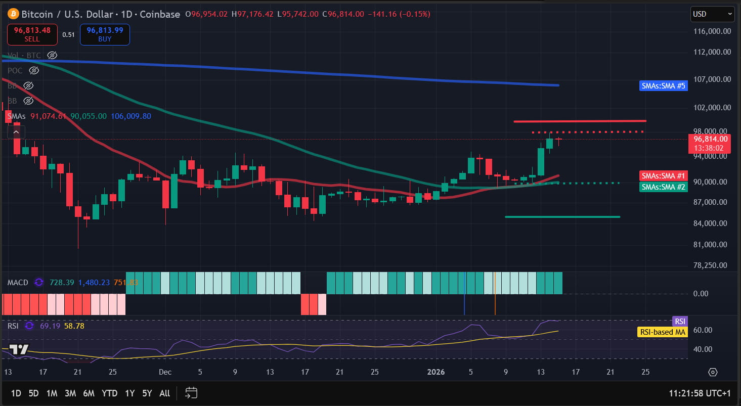 O BTC enfrentou volatilidade na sexta-feira, quando compradores e vendedores lutaram para estabelecer o controle. Os vendedores acabaram assumindo a liderança, com o preço caindo 0,56% para 90.515 dólares. A ação do preço foi mista durante o fim de semana, com uma leve queda no sábado antes de subir 0,54% no domingo, para 90.872 dólares. O preço enfrentou volatilidade na segunda-feira, quando compradores e vendedores lutaram para estabelecer o controle. Os compradores acabaram assumindo a liderança, com o BTC registrando um aumento marginal para 91.188 dólares. A criptomoeda líder disparou na terça-feira, subindo quase 4% para reafirmar os 95.000 dólares e fechar em 95.384 dólares. Os compradores mantiveram o controle na quarta-feira, com o BTC subindo 1,65% para 96.955 dólares. A criptomoeda líder está ligeiramente acima durante a sessão em andamento, negociando em torno de 97.010 dólares.