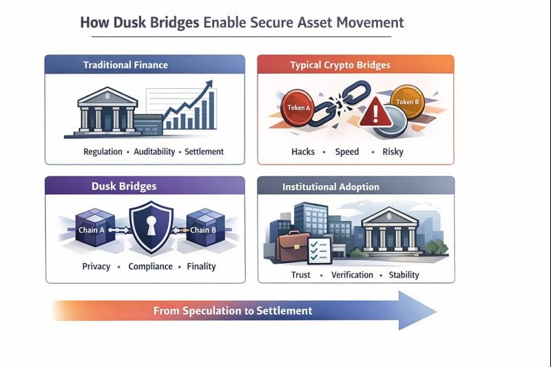 Dusk bridges provide regulators with something often missing in blockchain systems: enforceable visibility without total surveillance. Secure, compliant bridges are quiet infrastructure: they rarely capture attention, but they decide if blockchain systems will be able to support real economies, not simply trading venues. Long-term, the value of such systems lies in trust earned through design. When asset movement becomes predictable, private, and compliant by default, blockchain stops being an experiment and starts becoming infrastructure.