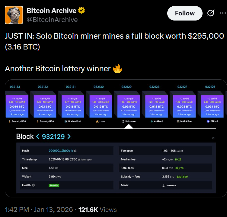 As redes sociais ficaram agitadas esta semana após os blocos do Bitcoin 932129 e 932167 serem minerados sem uma marcação de pool imediatamente visível, gerando especulações de que um minerador individual havia conseguido um grande prêmio, uma narrativa familiar sobre a "loteria do Bitcoin" que capturou brevemente a atenção do mercado.