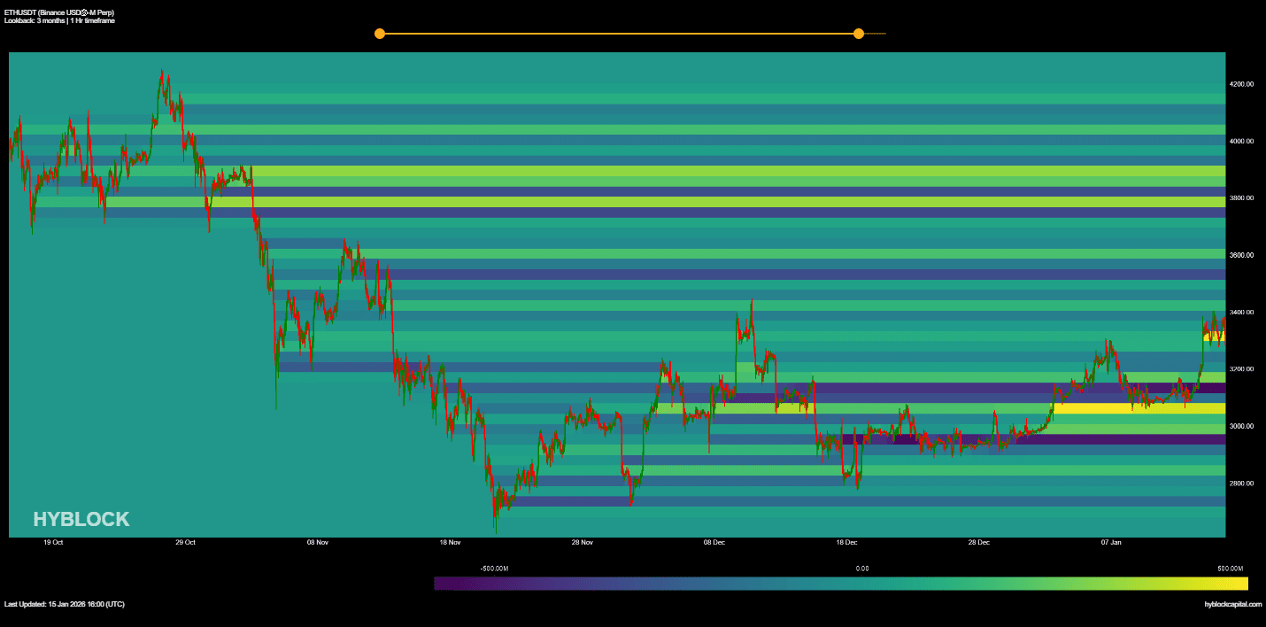 Apoiando essa visão, os dados da Hyblock mostram uma concentração líquida de posições longas acima de 500 milhões de dólares entre 3.040 e 3.100 dólares. Esse posicionamento denso aumenta a probabilidade de uma varredura de curto prazo nessa faixa, potencialmente preparando o terreno para um movimento de continuação mais forte depois.