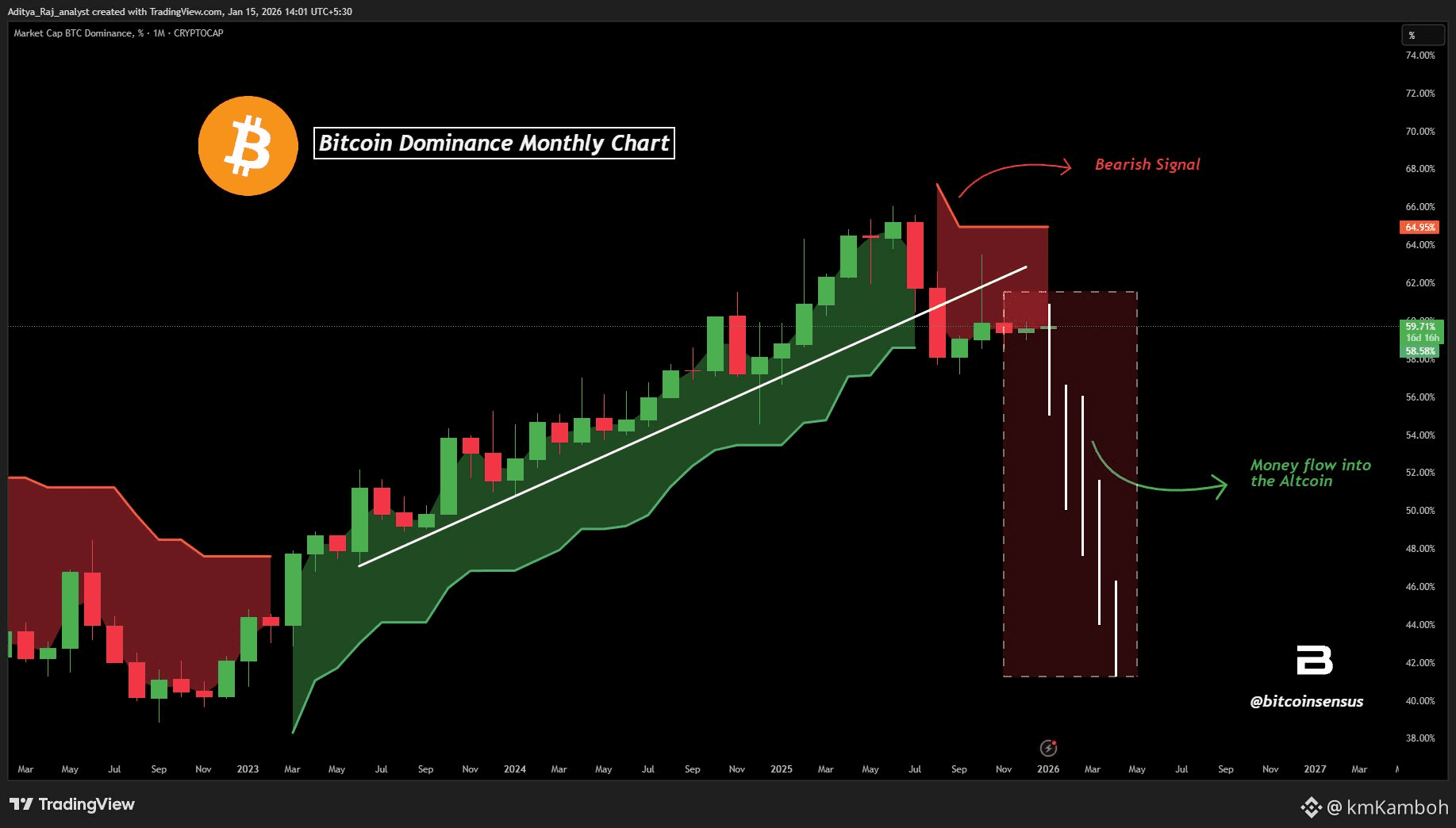 Big news! 🚨 Bitcoin's dominance (how much of the crypto market it controls) is struggling to break past 65%. It broke a monthly trendline, which is a sign that Bitcoin might not be as strong as it was.