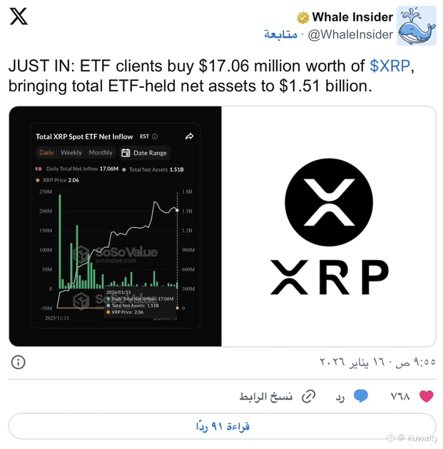شهدت صناديق ETF الفورية لعملة $XRP يوماً قوياً جديداً من الشراء. ففي 15 يناير، أضاف المستثمرون 17.06 مليون دولار إلى صناديق XRP، ما رفع إجمالي الأصول المُدارة إلى 1.51 مليار دولار. وتستند البيانات إلى SoSoValue، وشاركها حساب Whale Insider على منصة X.