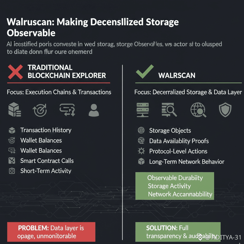 Execution chains ke explorers mostly short-term activity track karte hain. Storage layer ke explorer ka kaam long-term behaviour ko reflect karna hota hai. Walruscan isi liye important hai, kyunki Walrus ka core promise speed nahi, balki persistence hai.