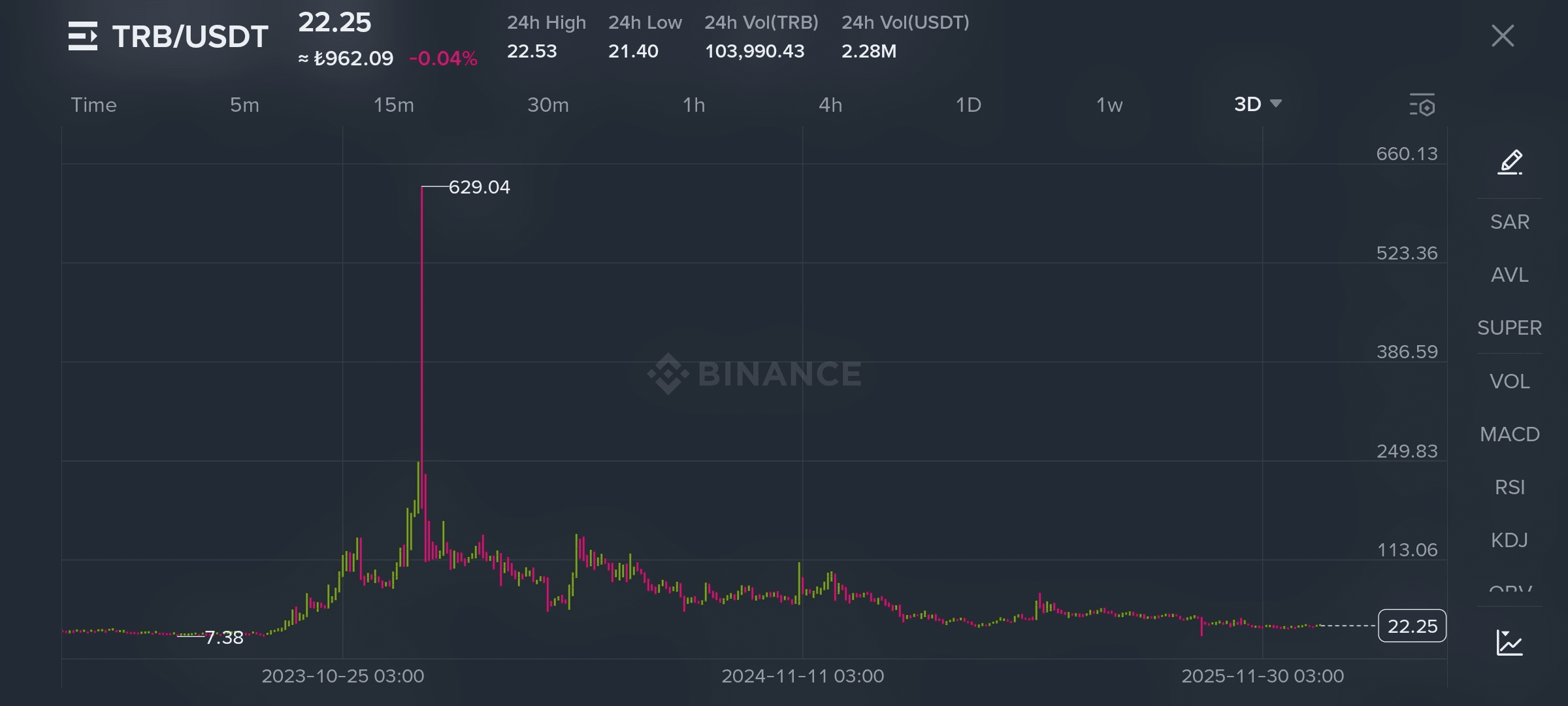 A oferta fixa cria escassez, enquanto a alta circulação (97%) limita a pressão inflacionária. A utilidade do TRB na mineração e governança impulsiona a demanda, embora as taxas de adoção e a concorrência (por exemplo, Chainlink) influenciem o valor a longo prazo.