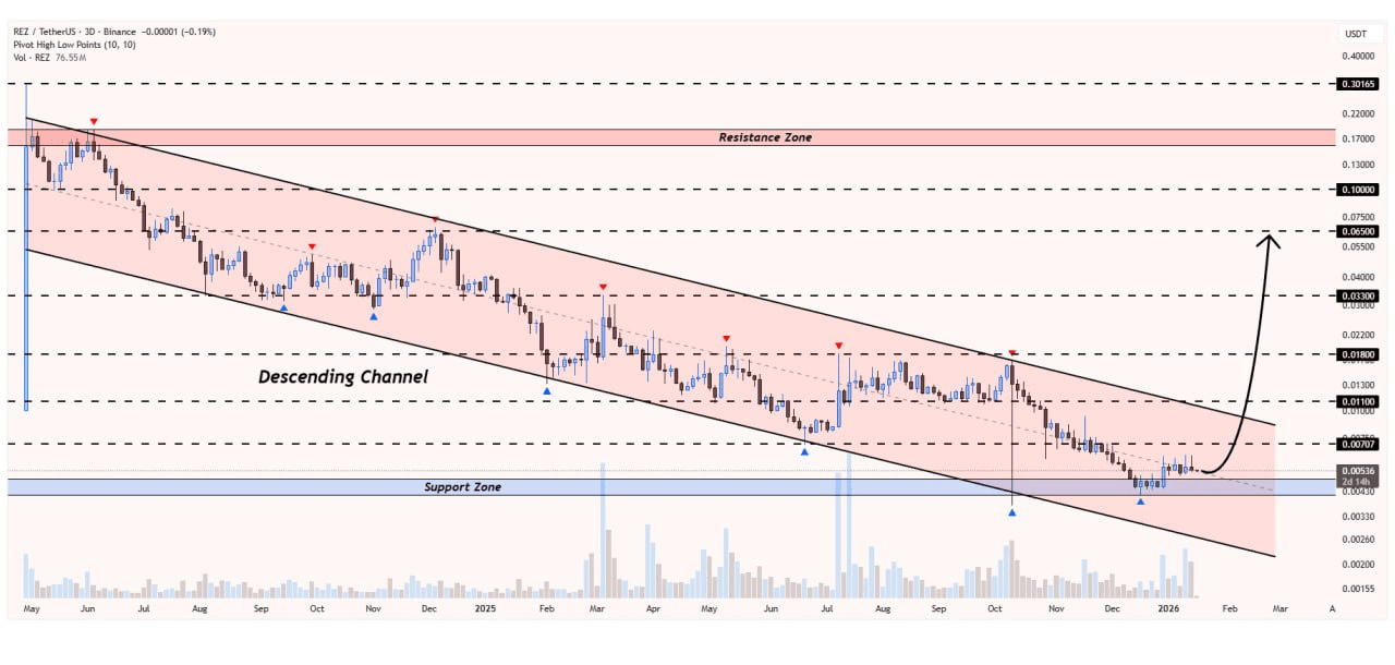 "Olá a todos! Olhando para o $REZ chart no intervalo de 3 dias, notei um padrão clássico de Canal Descendente que merece nossa atenção. 📉➡️📈