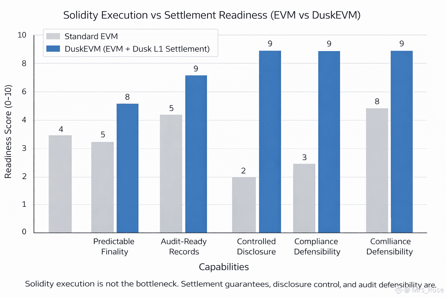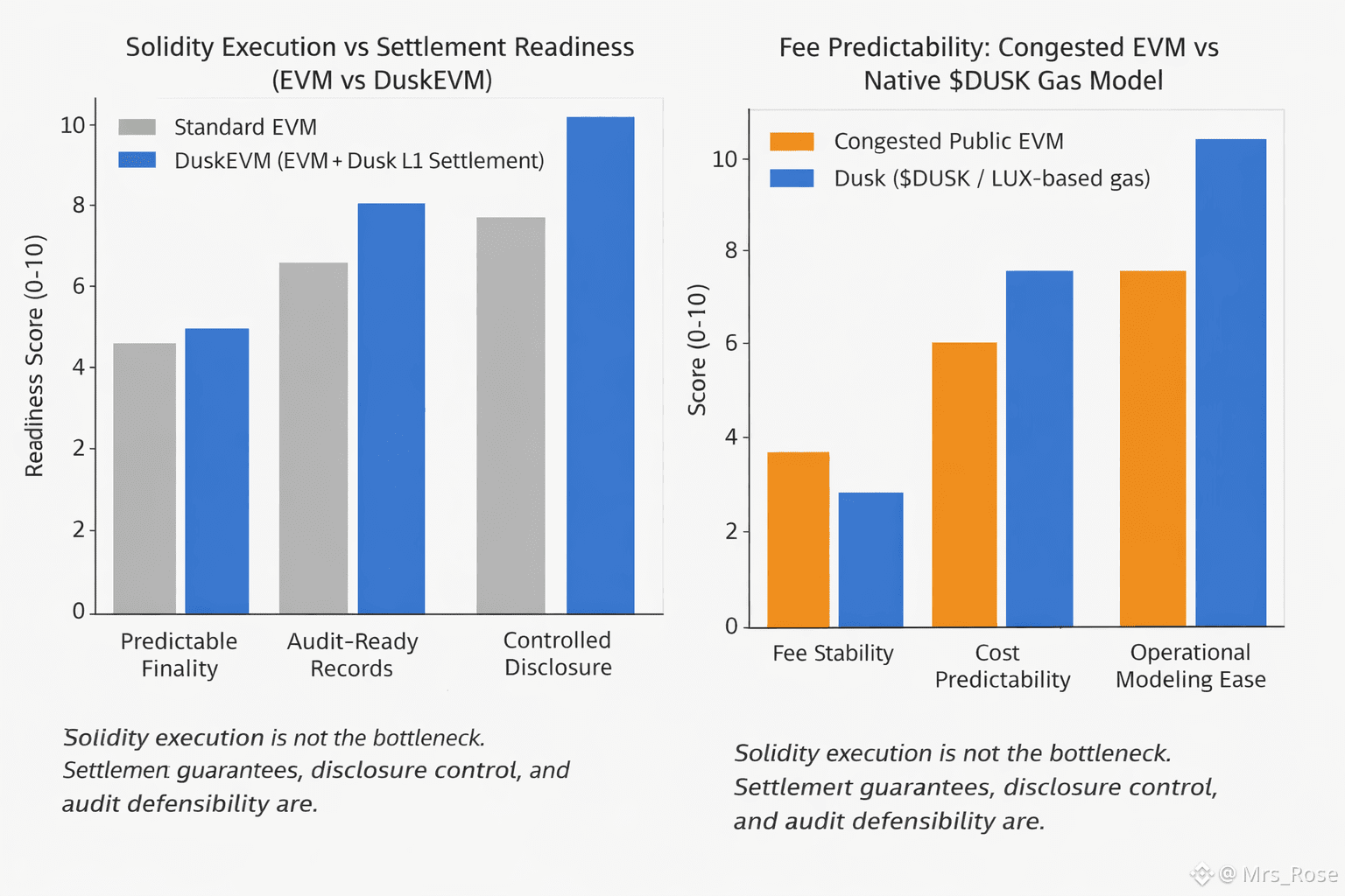 That’s the Solidity-to-settlement friction I keep seeing. Your contracts deploy fine on an EVM chain, but once you try to plug into regulated workflows, you hit stuff Solidity doesn’t solve by itself: predictable finality, audit-ready records, controlled disclosure, and operational rules that compliance teams can actually defend.
