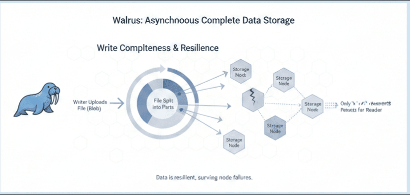 Uma das coisas mais importantes para entendermos é algo chamado Completação de Escrita. Imagine que você está enviando um projeto muito importante para a rede Walrus. Você quer ter 100% de certeza de que, uma vez que você clicar em enviar, o arquivo realmente esteja lá. Se você agir honestamente, o sistema garante que cada bom nó na rede eventualmente receberá uma parte do seu arquivo.