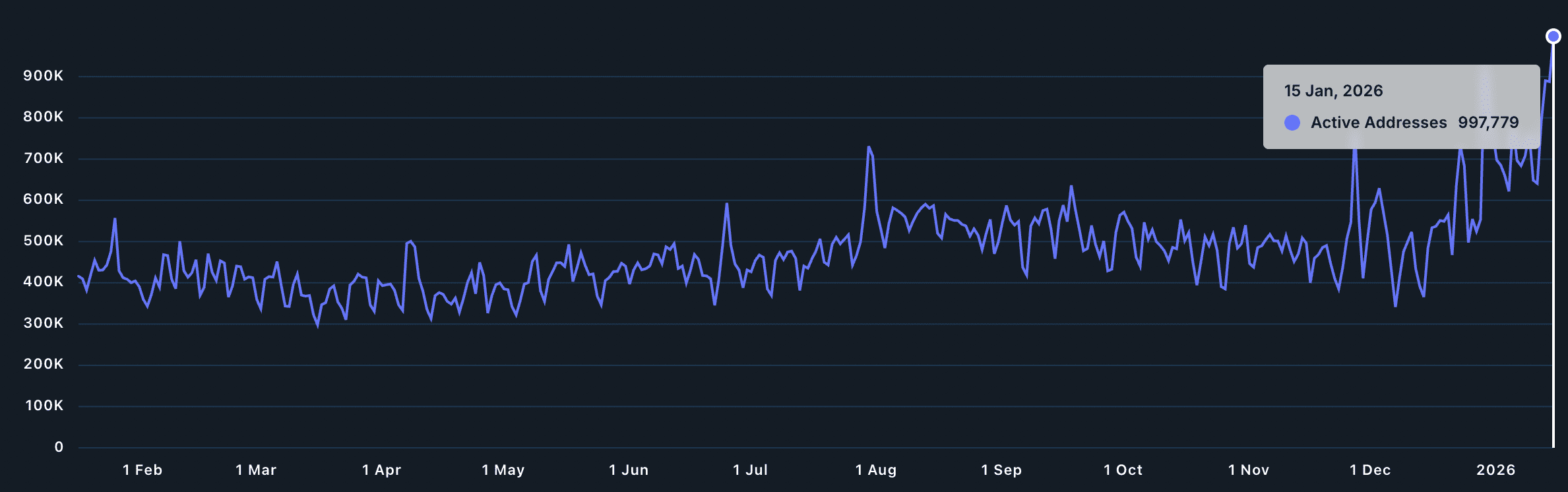A atividade da rede do Ethereum continua a mostrar força, com endereços ativos aumentando em 53% nos últimos 30 dias, atingindo um pico de 28 meses de 995,779 em 15 de janeiro, de acordo com dados da Nansen.