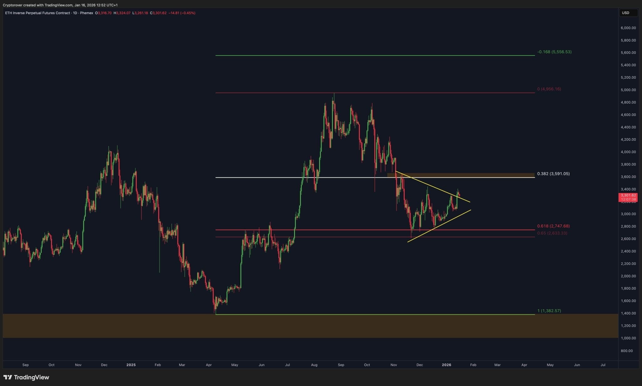 De acordo com Crypto Rover, o ETH está pronto para explodir, pois mostra força após romper um triângulo simétrico. O alvo deste padrão de triângulo no gráfico diário é $4,500, de acordo com dados do TradingView.