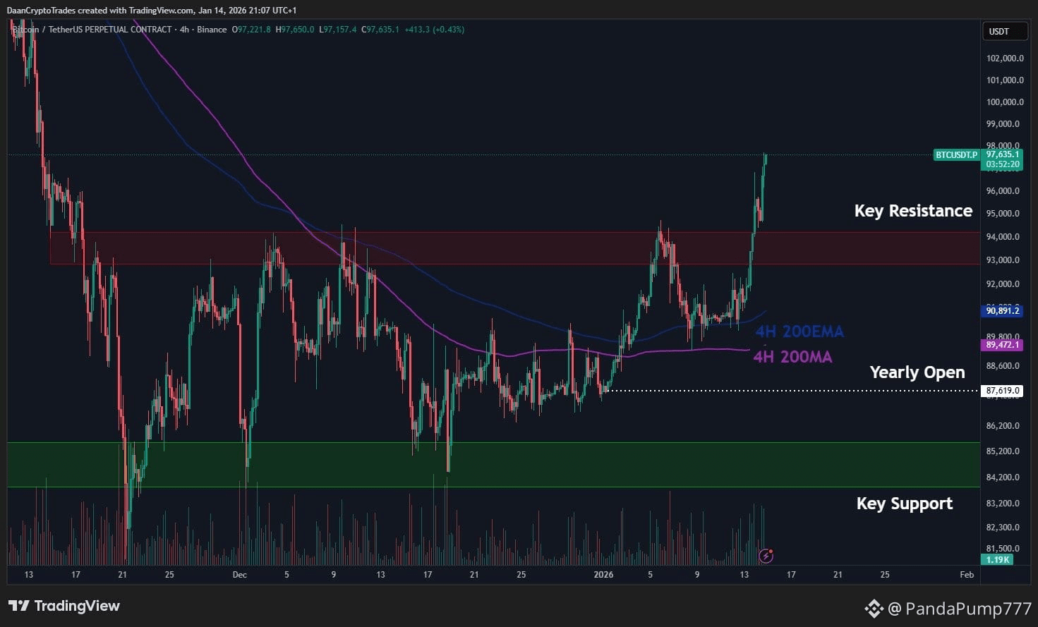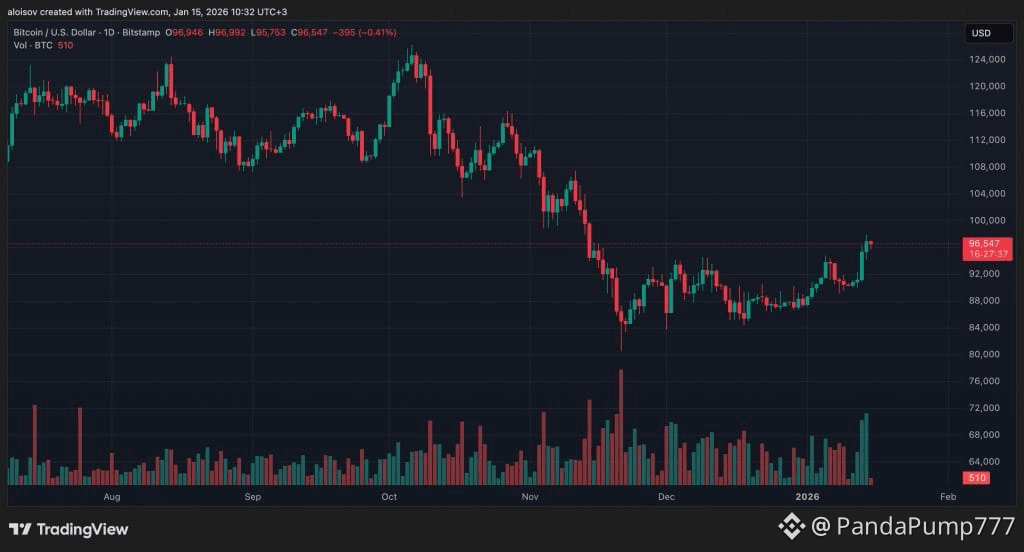1. Технический прорыв: После долгого бокового движения в диапазоне $94 000 – $96 000 биткойну удалось преодолеть этот уровень, достигнув отметки $97 939 на Bitstamp 13 января. Аналитики считают, что прорыв будет подтверждён, если цена удержит $94 000 как новую поддержку.