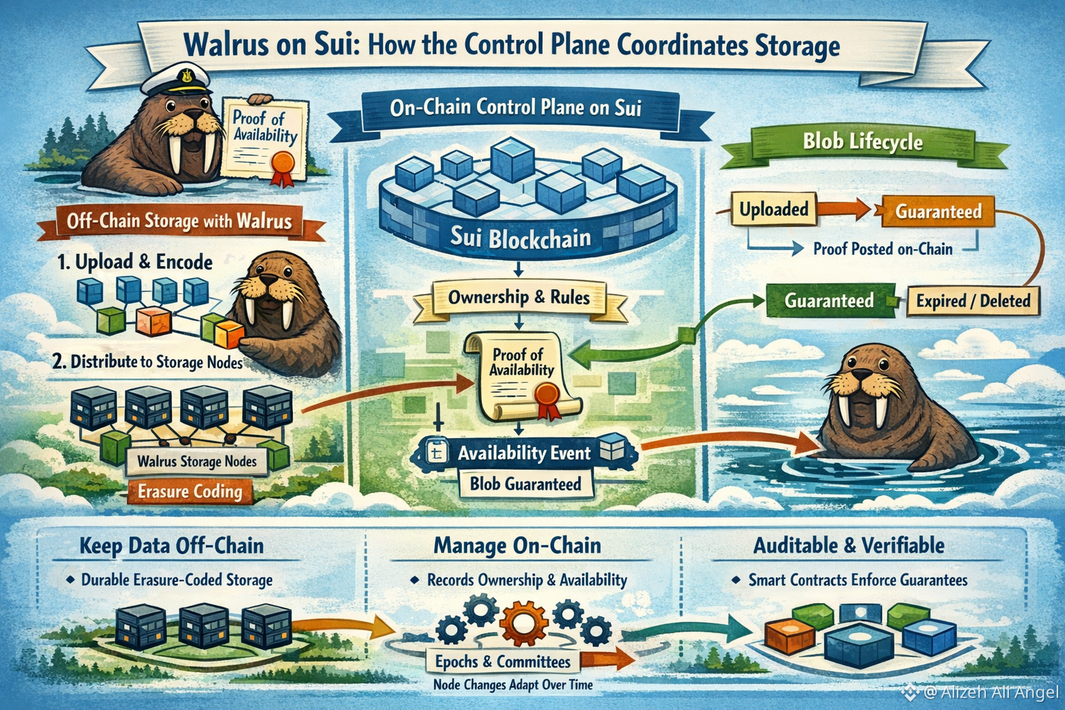 Walrus pushes a clearer separation of duties: keep the bytes off-chain, but keep the promises on-chain. In practice, Sui becomes the control plane where rules, ownership, and status are recorded, while Walrus storage nodes handle the heavy lifting of holding encoded data. Walrus describes each stored “blob” as having an onchain representation on Sui, with the key idea being that blob ownership maps cleanly onto object ownership, so applications can reason about access and lifecycle without inventing a parallel permission system.