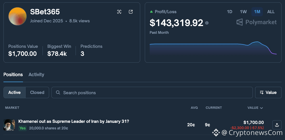 A third wallet, known as SBet365, remains active, as Lookonchain noted that this account placed a new wager two days ago predicting that Iran’s Supreme Leader Ayatollah Ali Khamenei would be removed from office by the end of January.