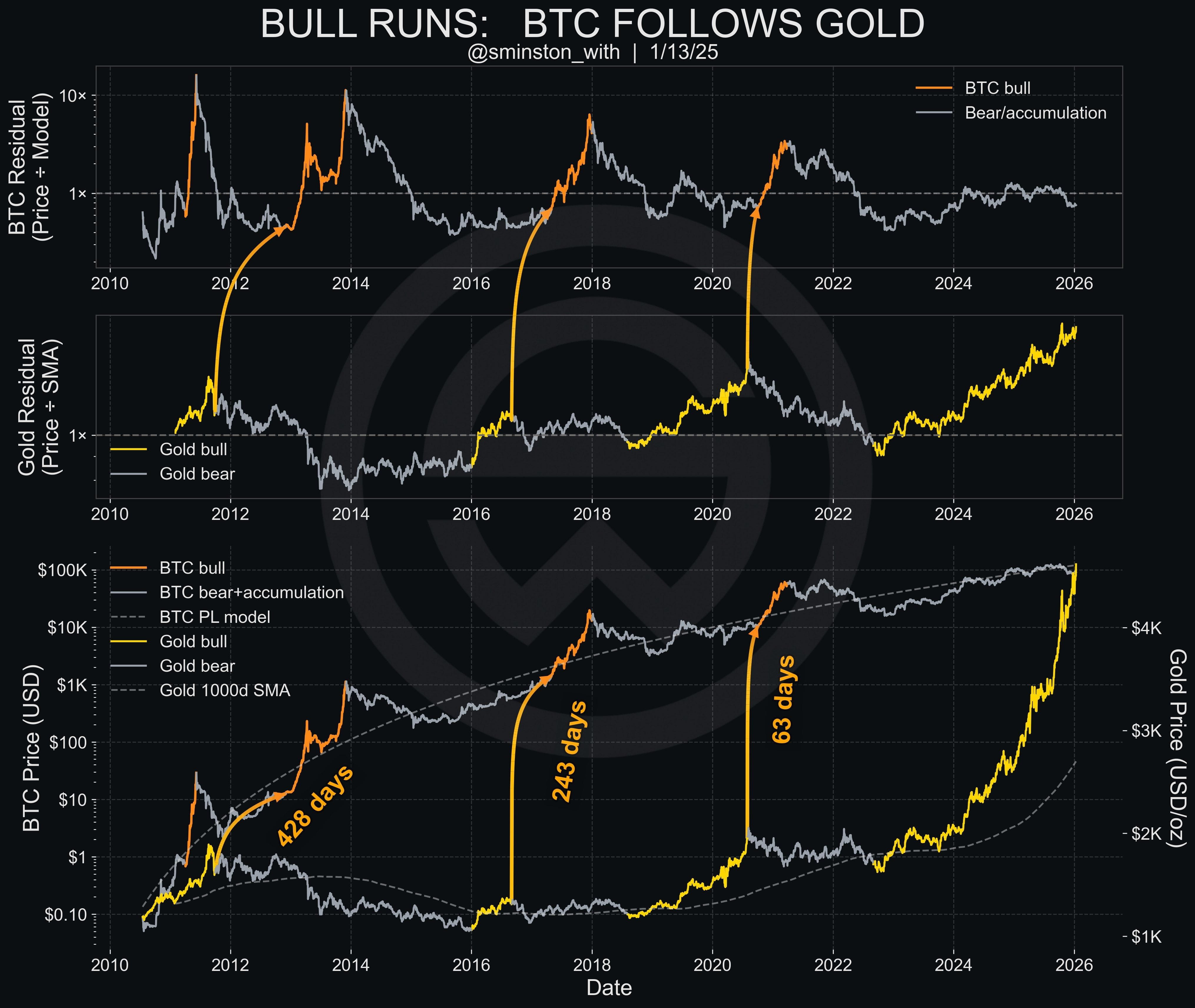 Além disso, dados históricos sugerem que as expansões de preço mais fortes do Bitcoin tendem a seguir mercados em alta de ouro.