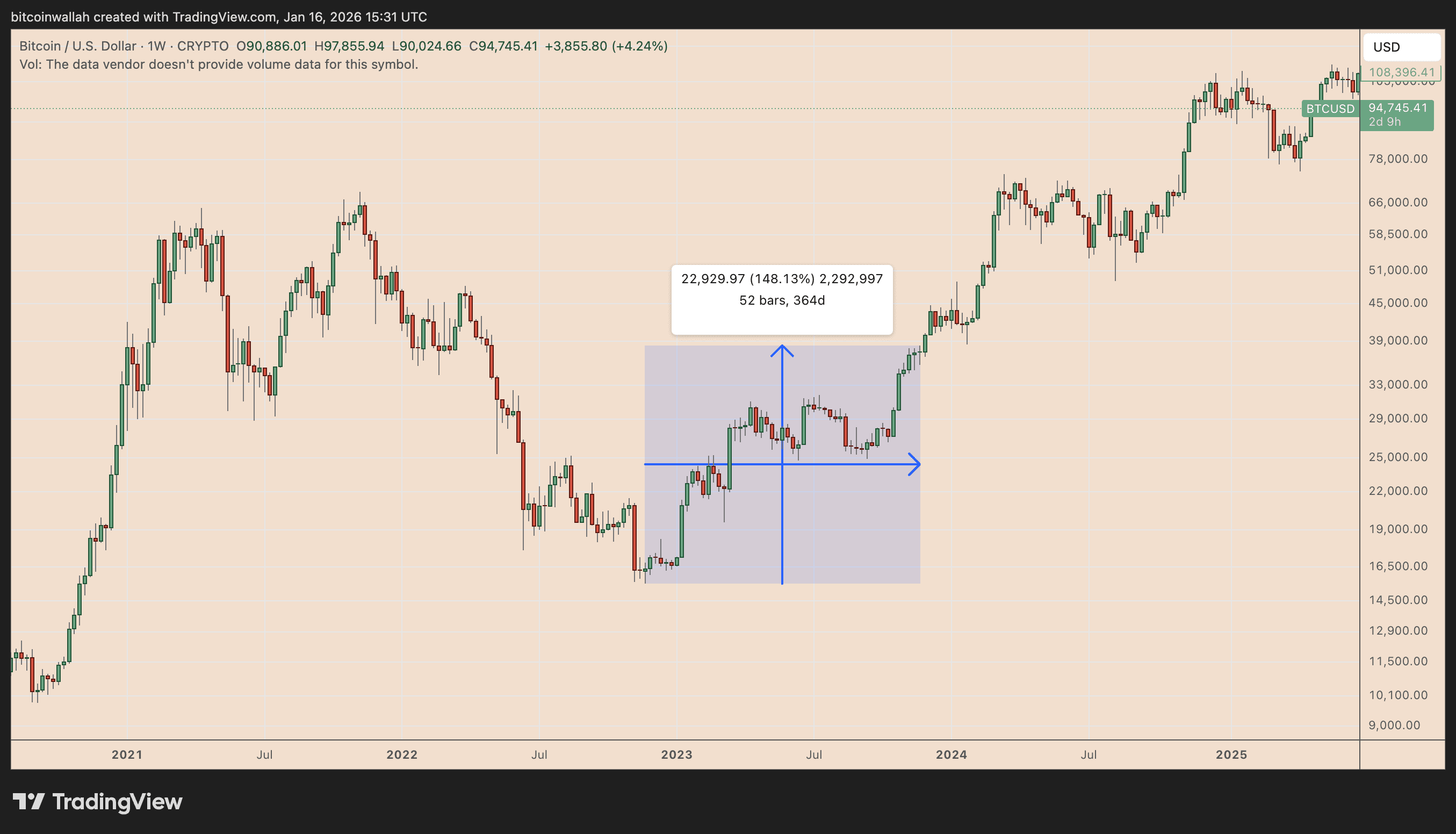 Gráfico semanal BTC/USD. Fonte: TradingView