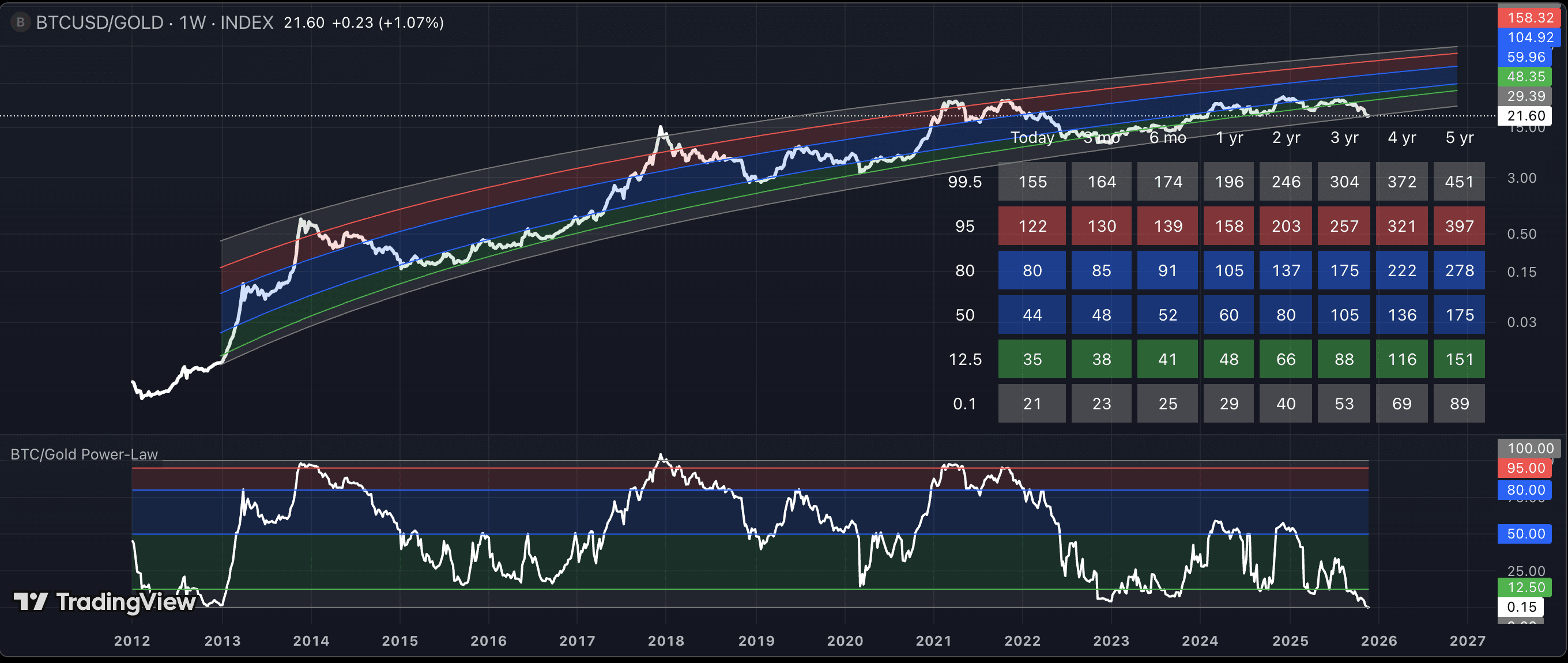 Historicamente, os movimentos na razão BTC/XAU em direção à zona de desvio padrão -2 precederam períodos prolongados de Bitcoin superando o ouro, como mostrado no gráfico das bandas de Lei de Potência abaixo.