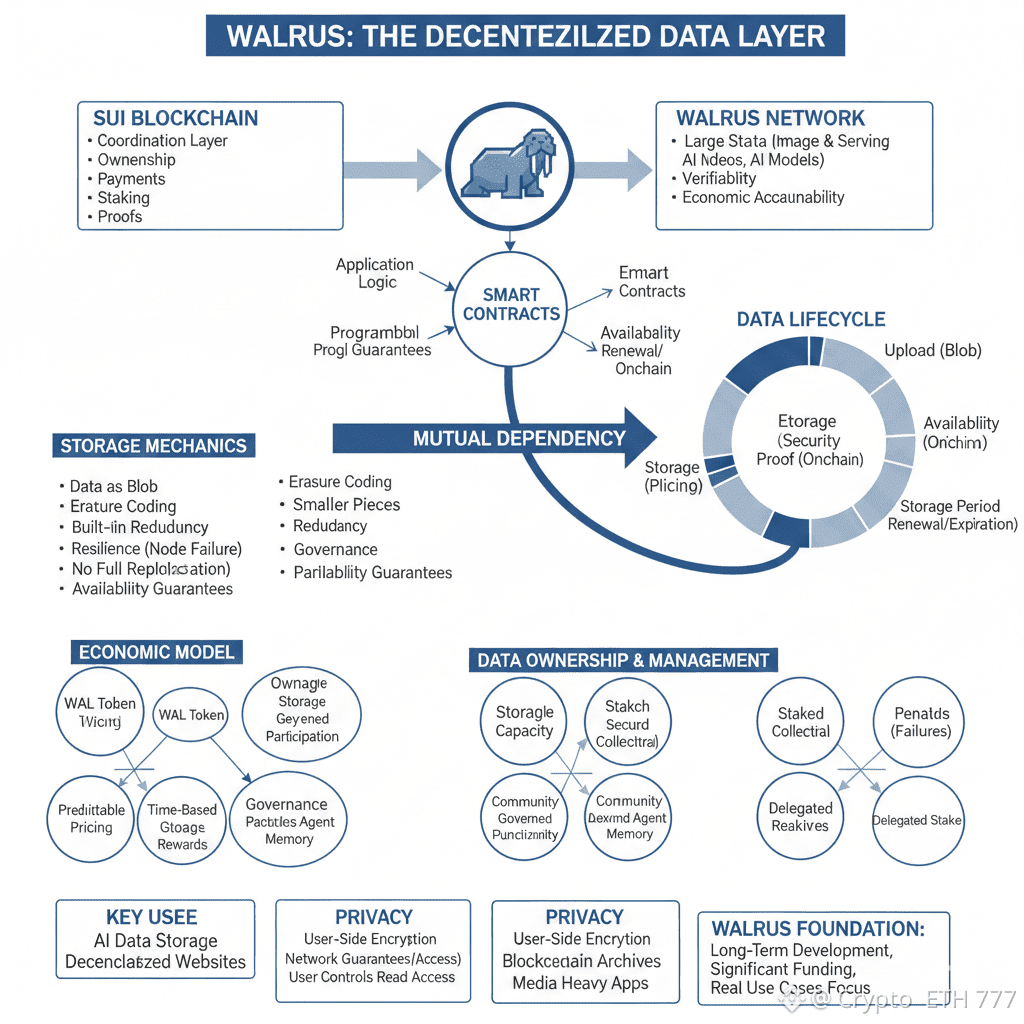 The Sui blockchain acts as the coordination layer that handles ownership, payments, rules, staking, and proofs, while Walrus focuses purely on storing and serving data at scale. This division allows each layer to do what it does best without compromise.