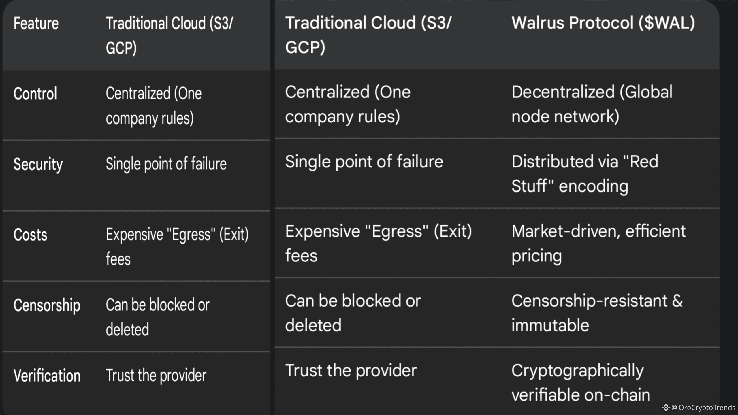A direct comparison—Walrus decentralized storage vs. AWS S3 and Google Cloud—zeroing in on what matters most: efficiency and security.