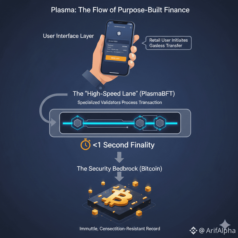 • The "High-Speed Lane" (PlasmaBFT): The transaction is picked up by specialized validators optimized for stablecoin volume. It hits finality in <1 second.