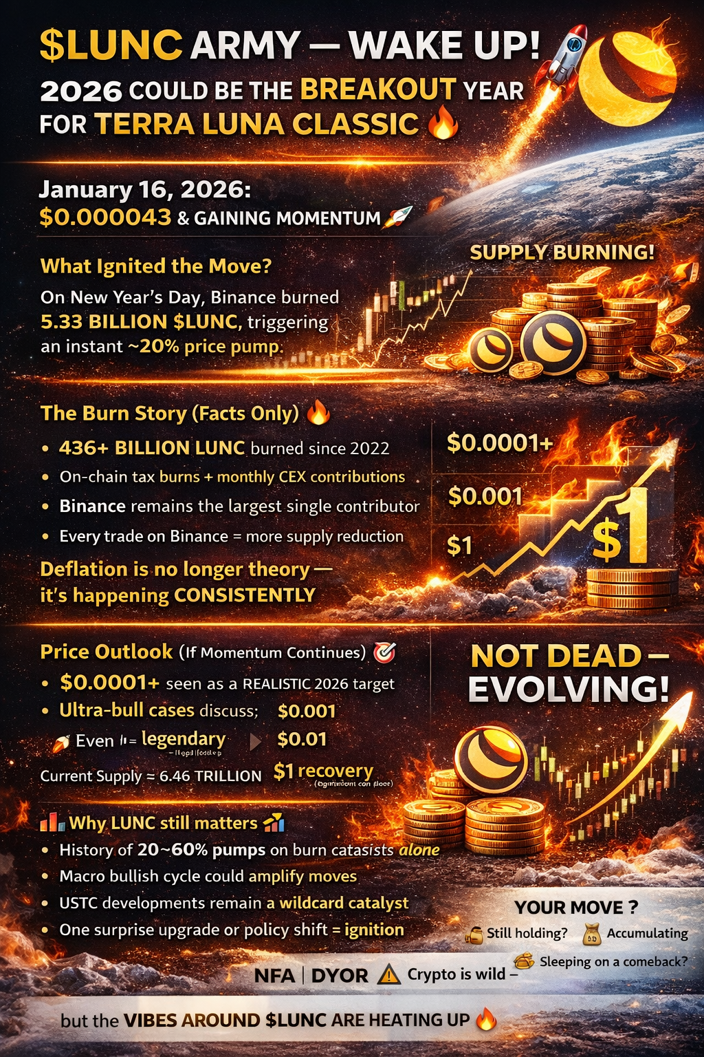 A partir de 16 de janeiro de 2026, $LUNC está sendo negociado perto de $0.000043, e a momentum está claramente se acumulando.