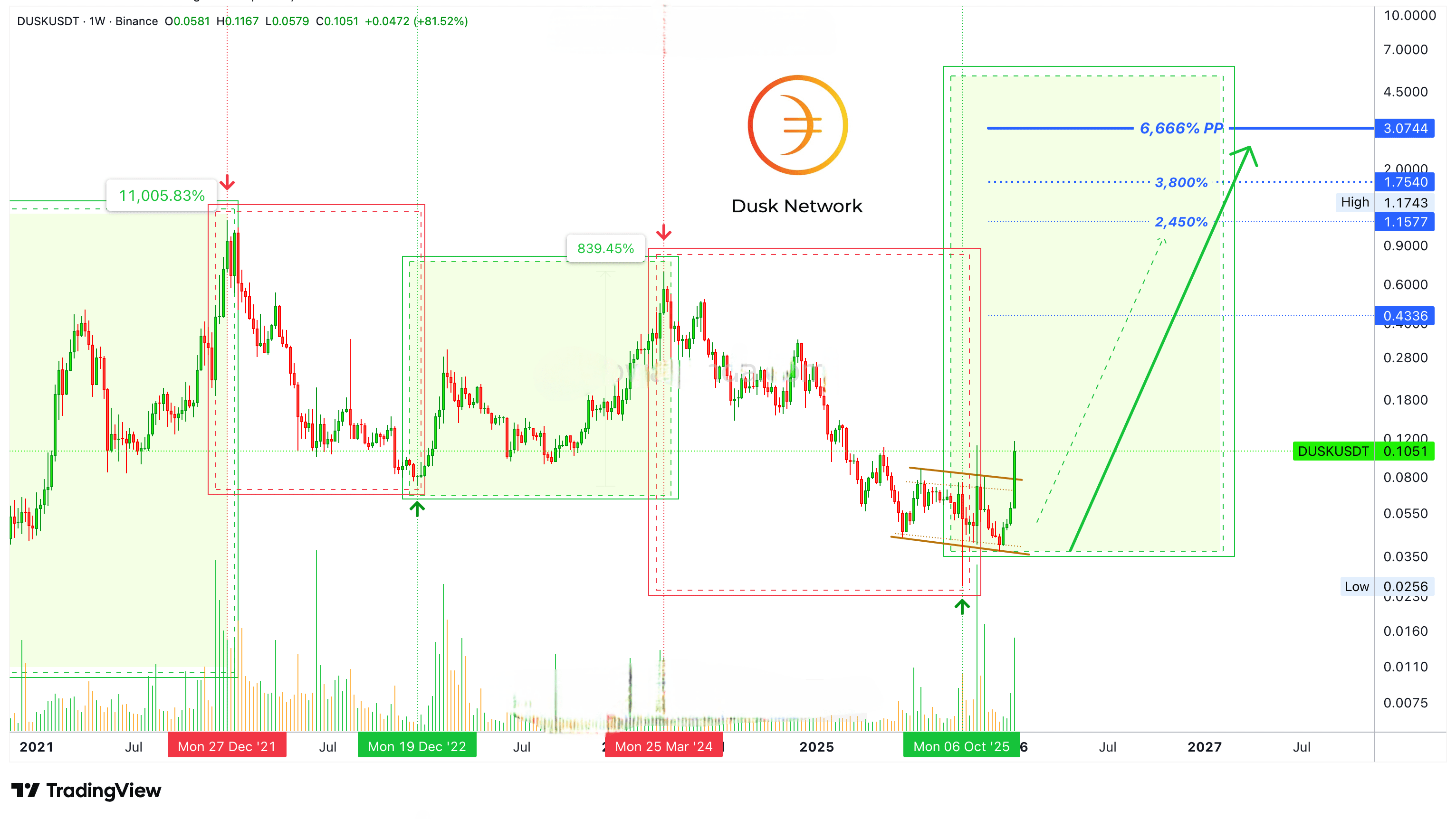 Estamos acompanhando o DUSK desde o flush em outubro e este projeto se destaca por causa de um forte movimento em novembro. Esse movimento produziu o maior volume desde 2022, o que para nós sinaliza o início de um novo ciclo de alta.