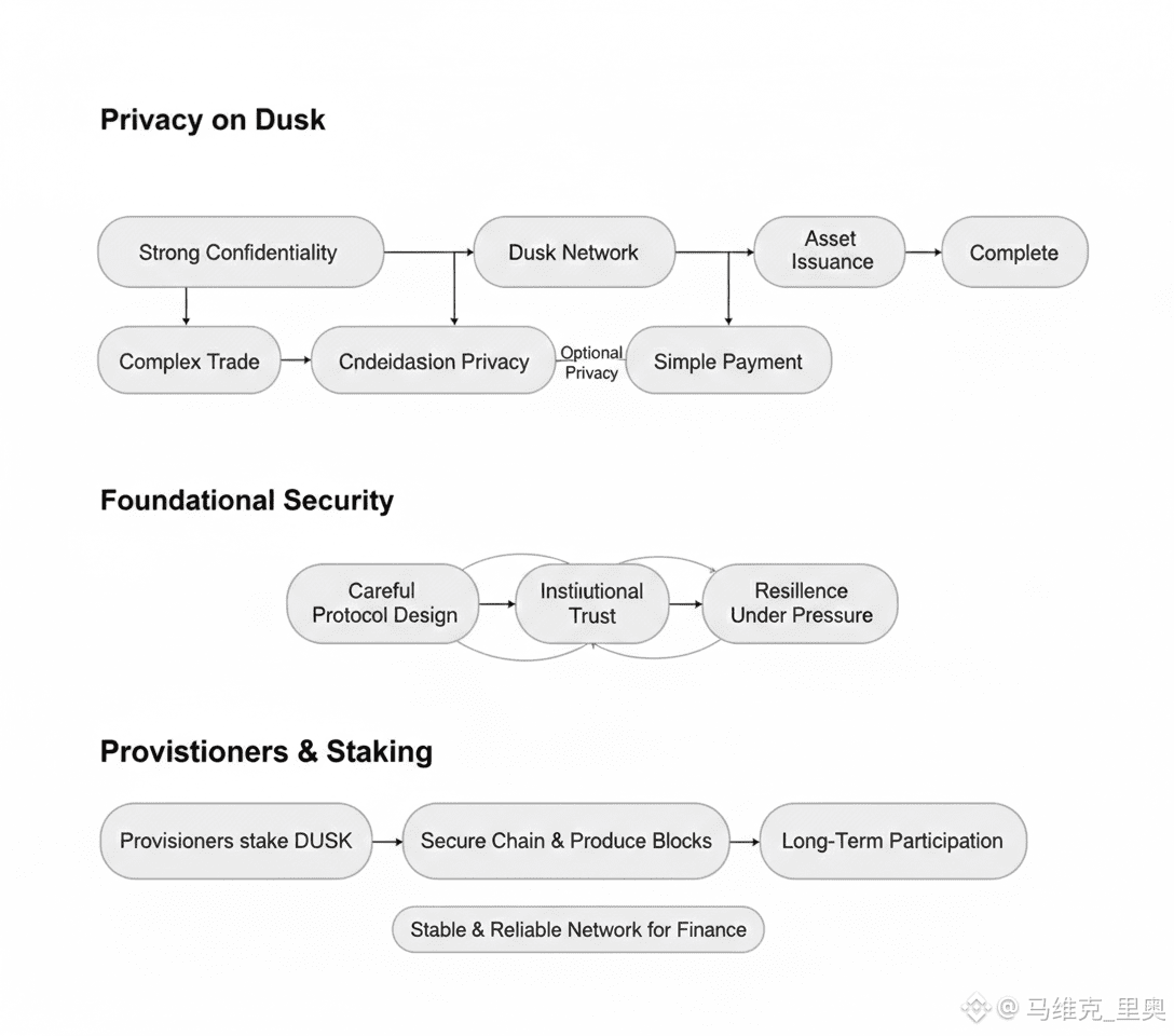 安全性在 Dusk 中被视为基础原则。项目在审计、测试和协议设计上投入了大量精力。这类工作通常不会引起太多关注,但却决定了严肃机构是否能够真正信任一个区块链系统。共识机制、激励结构和网络规则都被设计为在压力环境下依然稳定运行。机构不会相信空洞承诺,他们只会相信在各种情况下都能正常运作的系统。