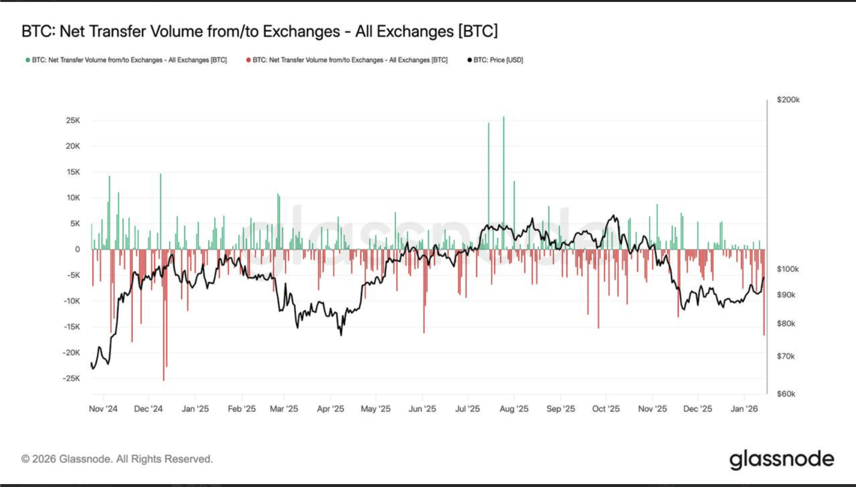Volume líquido de transferência de BTC de/para exchanges. Fonte: Glassnode