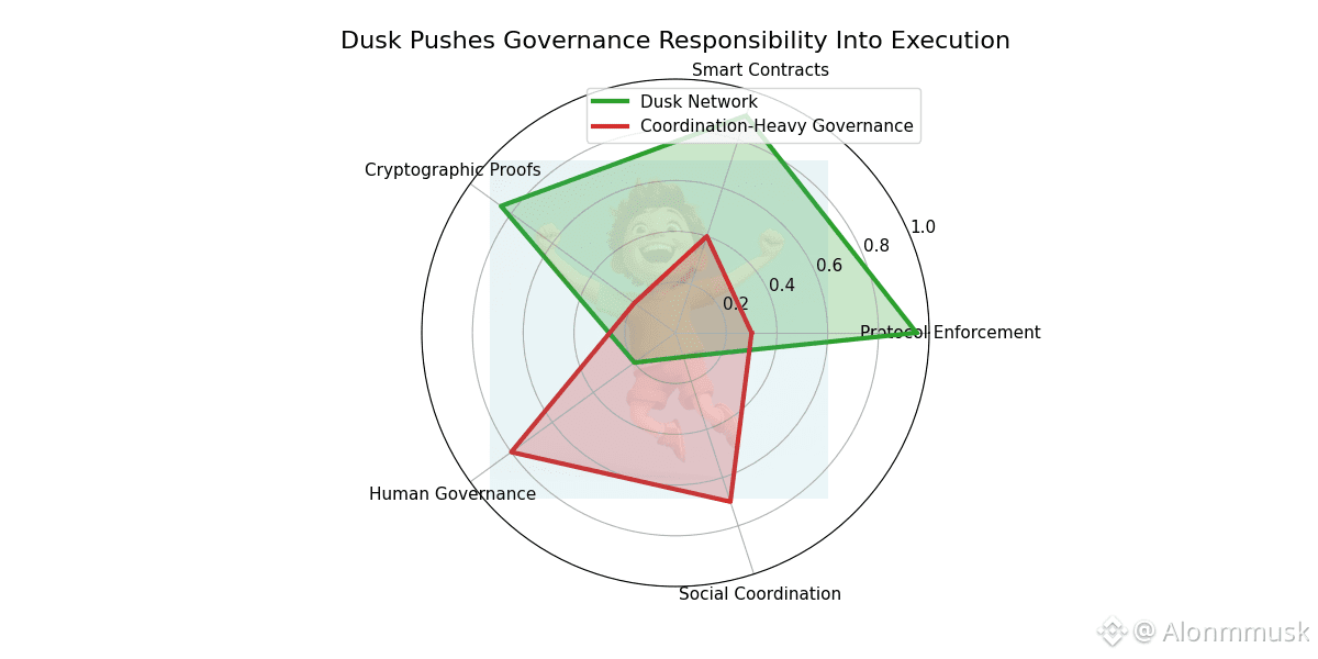 As the space matures, the limits of coordination-heavy governance become harder to ignore. Systems that depend on interpretation struggle under scale and stress. Infrastructure that turns governance decisions into execution logic behaves more reliably. Dusk Network is aligning with that reality by treating governance as a design problem, not a social process.
