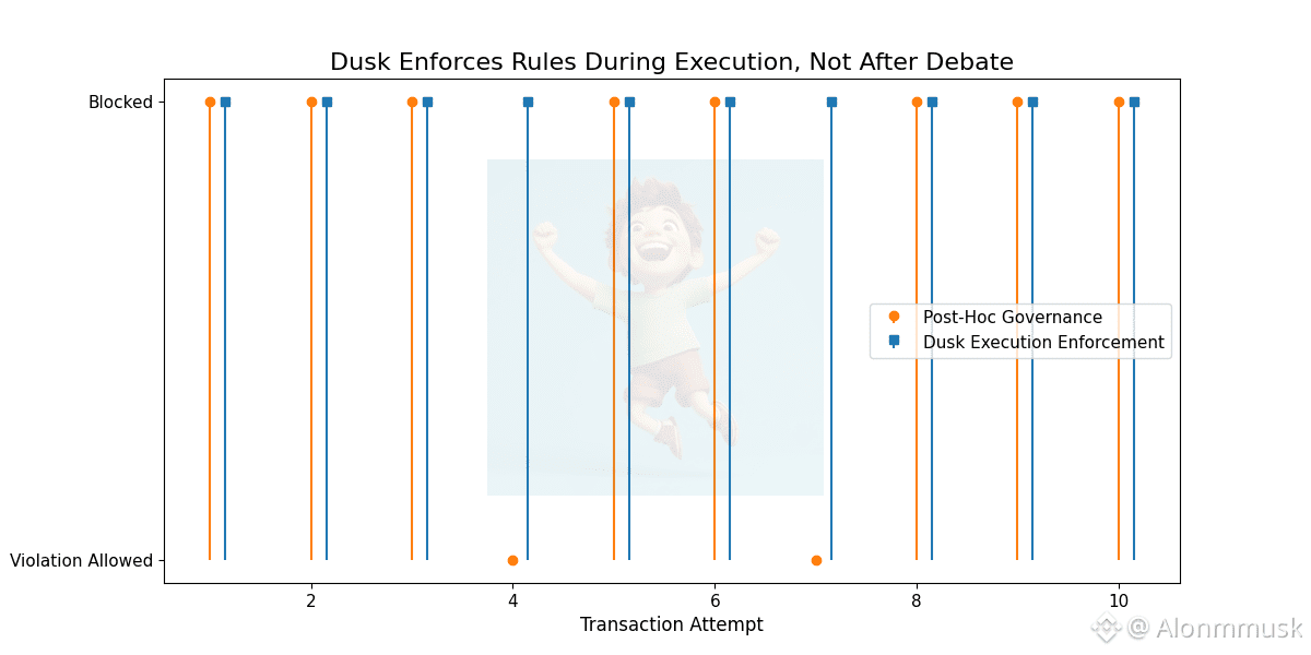 In traditional finance, governance and enforcement are separate by design. Policies define boundaries, but systems enforce them mechanically. Once a rule exists, it applies the same way every time. Many blockchains blur this line. Rules exist, but enforcement depends on interpretation, visibility, or intervention after the fact. Dusk starts from a simpler, less forgiving assumption. If rules matter, they should not depend on judgment calls. They should execute automatically.