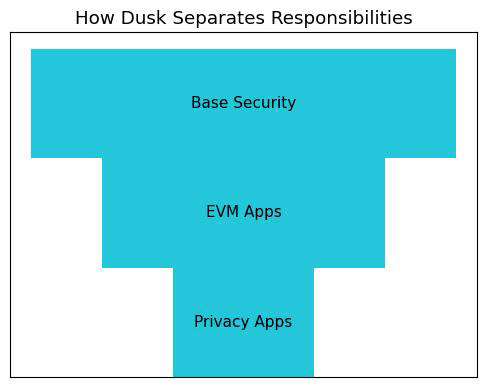 Esta é a razão pela qual a abordagem modular da Dusk é importante. Uma arquitetura de três camadas foi descrita pela Dusk e supõe-se que torne a adoção mais viável. É para dividir as tarefas de modo que cada camada possa realizar suas tarefas de forma eficaz, e que os construtores possam ser integrados com uma quantidade menor de atrito temático.